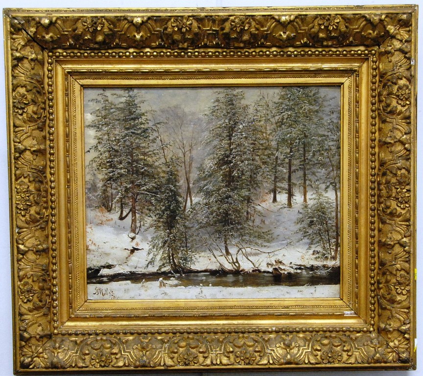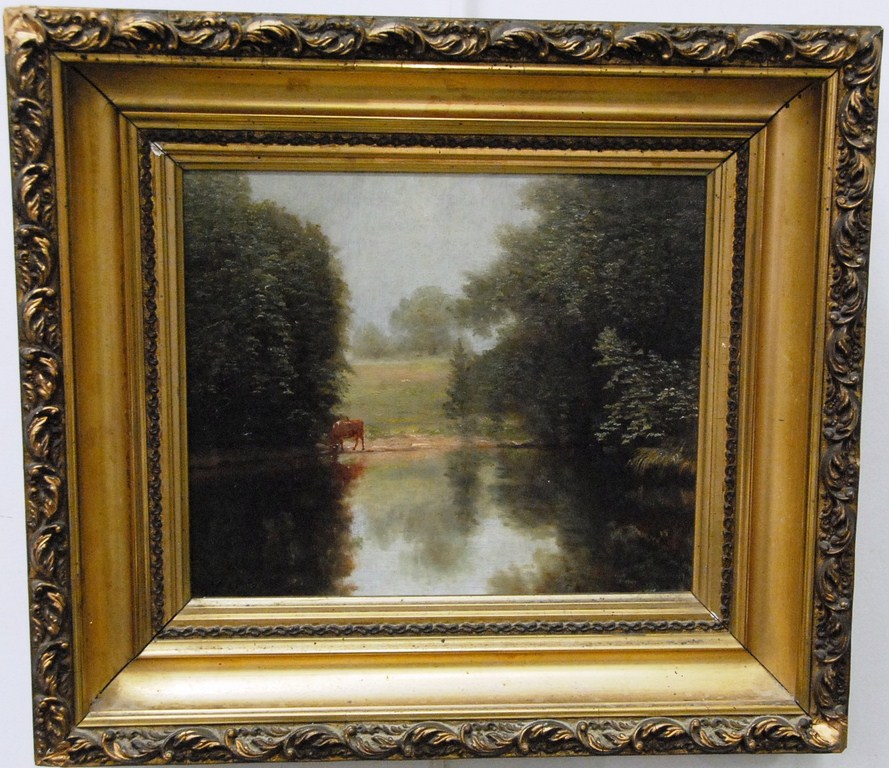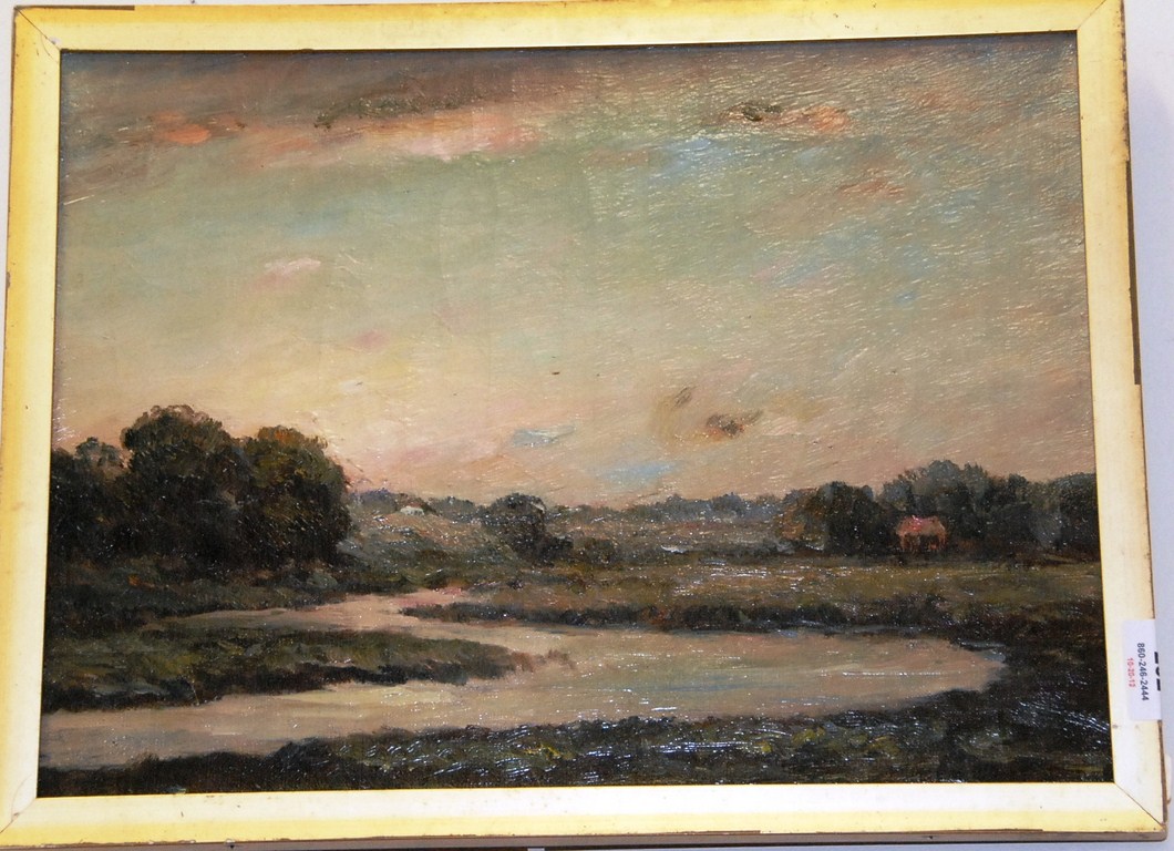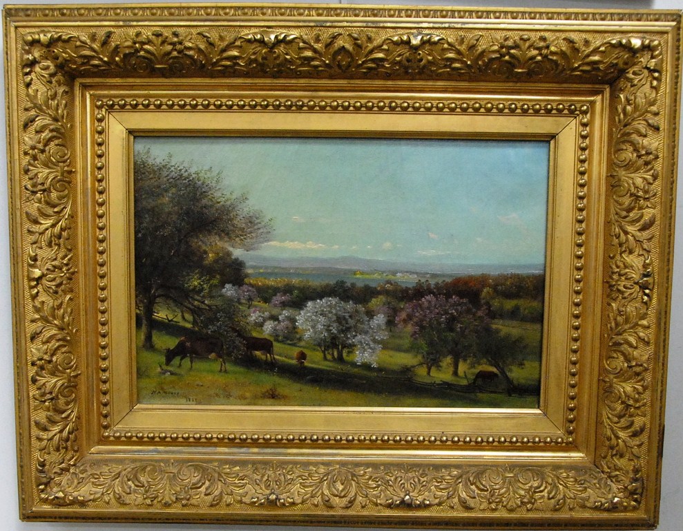 Nelson Augustus Moore 1824-1902 SPRING FARM LANDSCAPE WITH BLOSSOMING APPLE TREES oil on canvas signed lower left N. A. Moore 1868 12 x 18. From the collection of Thomas and Alice Kugelman
