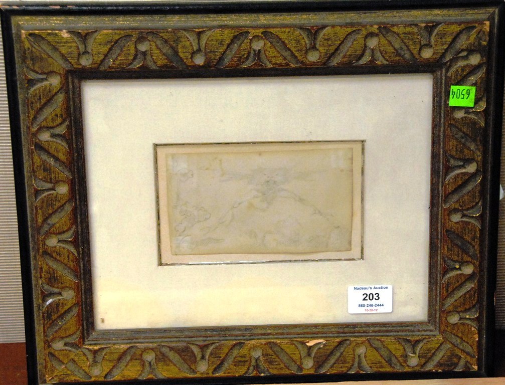 GOYA GROTESQUE FIGURE – original pencil drawing of grotesque figure having provenance written on reverse. 3 1/2 x 6 1/8 Provenance: R. R. Augustus Hawkins Library, Trinity College, Cambridge Lefort, Ministere de L’Instruction Beaux Artsi Klipstein and Kornfeld Catalogue 1966.