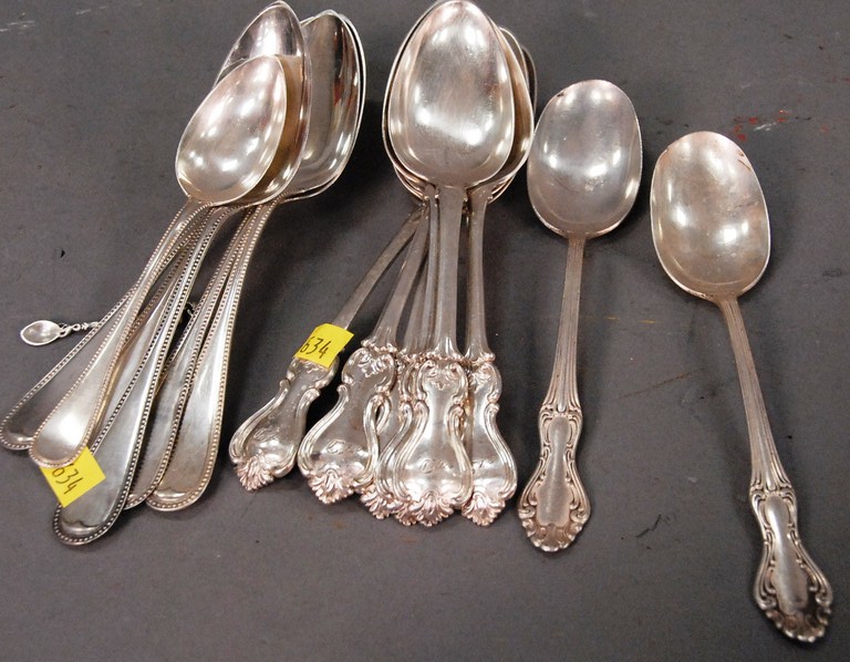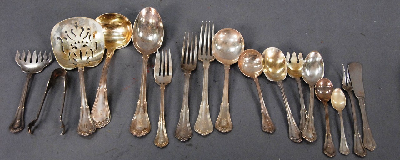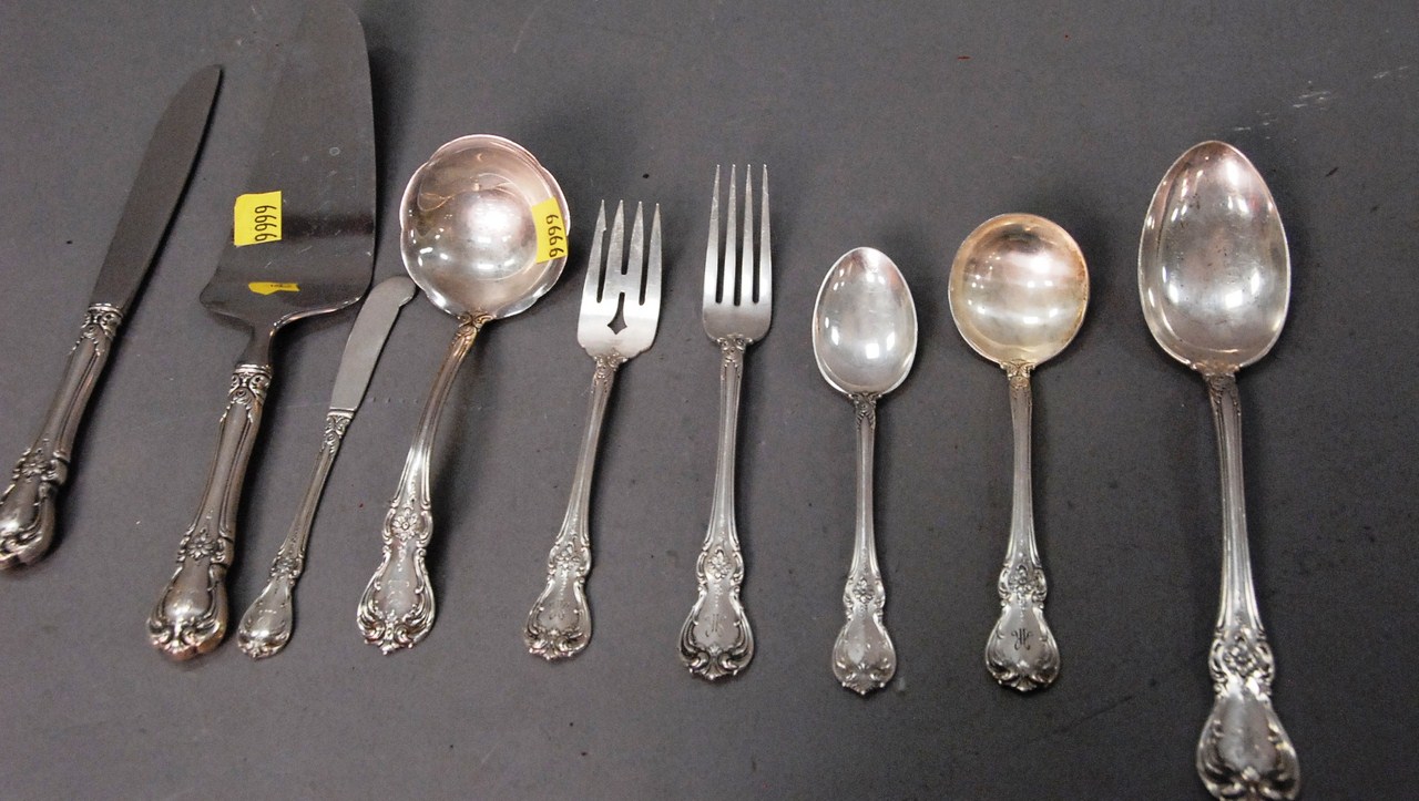Towle sterling silver flatware set, setting for eight plus serving pieces, Old Master pattern, monogrammed. 54.6 t oz. of weighable silver plus 9 handles