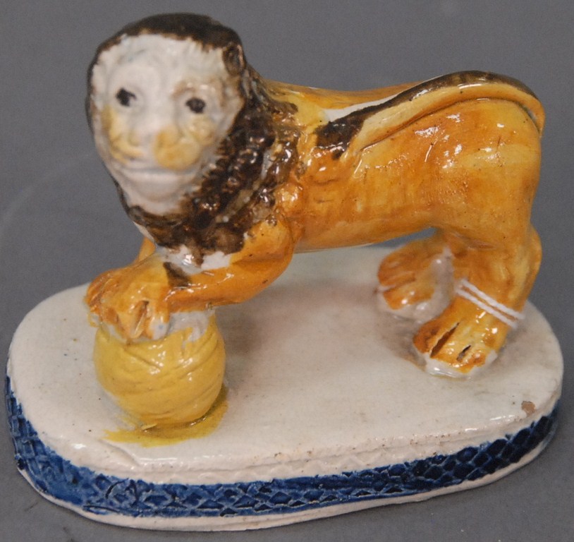 Staffordshire lion figure male lion with paw on ball base, circa 1820. ht. 3in. Provenance: Estate of Charles Archibald Goodwin and Ruth Cheney Goodwin.