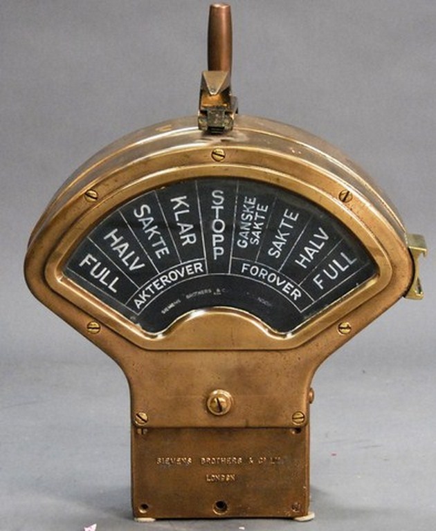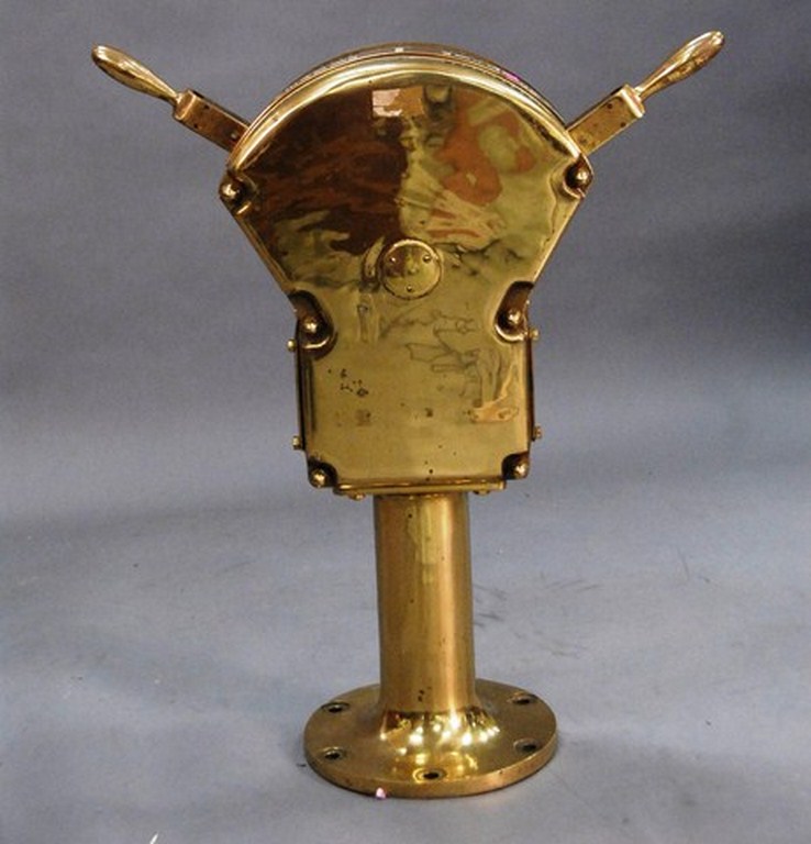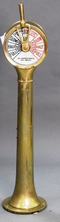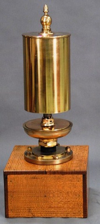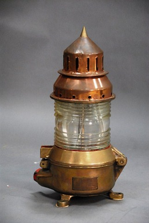 Large brass and copper nautical lantern Gas Accumulator CO UK Ltd. masthead or buoy lantern having brass cylindrical base with clear glass lens with copper mushroom formed top, base having maker’s plaque marked Gas Accumulator Co UK. Lighthouse Engineers Beacon Works Brentford, England No 2064 LBFD 200. ht. 33in.