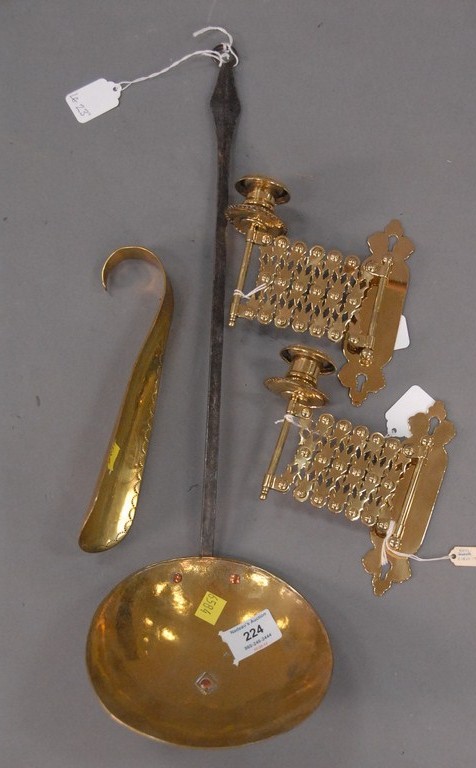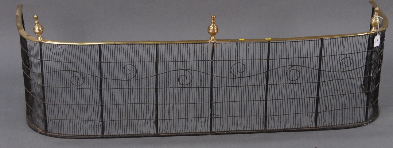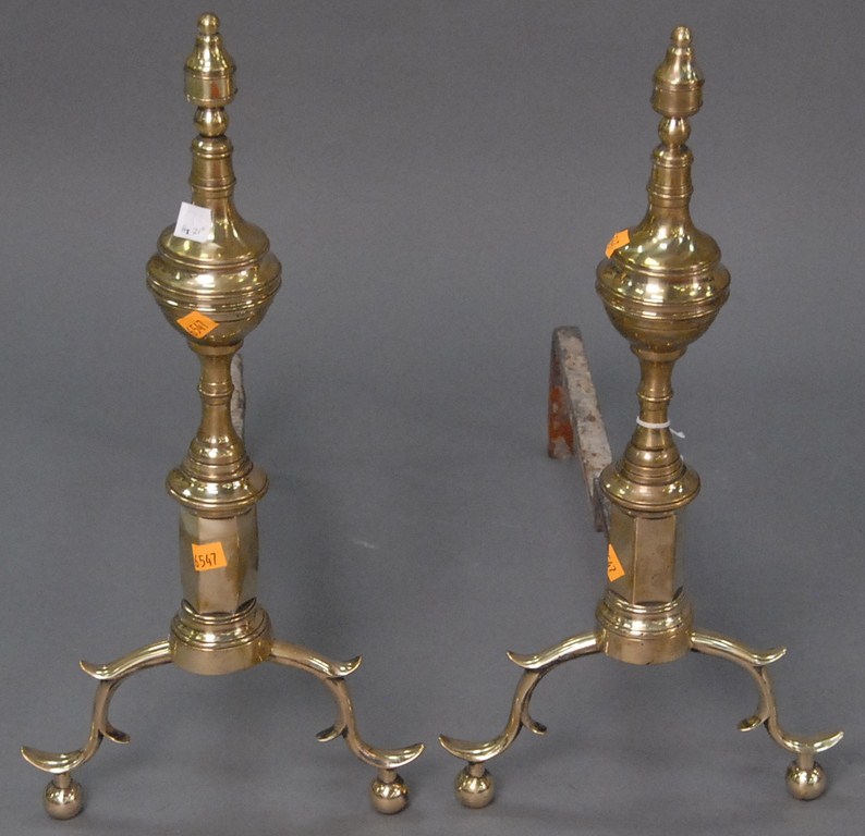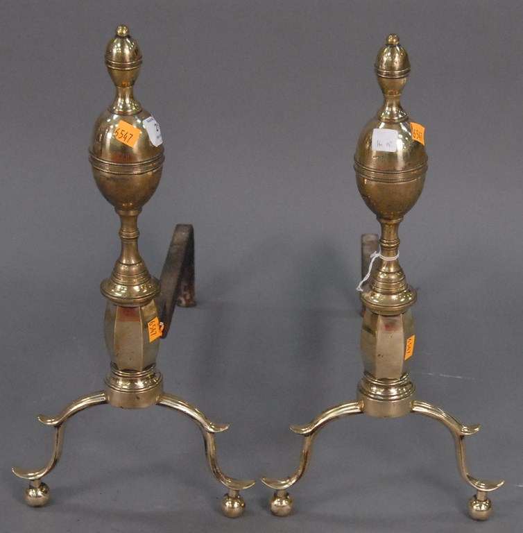 Fine pair of Federal brass andirons having spired tops over bold ring and baluster turnings on arch-spurred legs ending in ball feet, complete with original iron log rests, New England or New York circa 1800. ht. 21in.