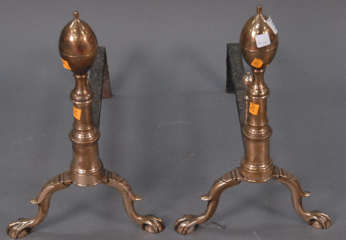 Pair of Chippendale bell metal andirons having banded ring turned lemon shaped tops with turned and bulbous shafts, on spurred legs, ending in claw and ball feet, complete with original log stops, Boston second half 18th century. ht. 17in. dia. 19 1/2in.