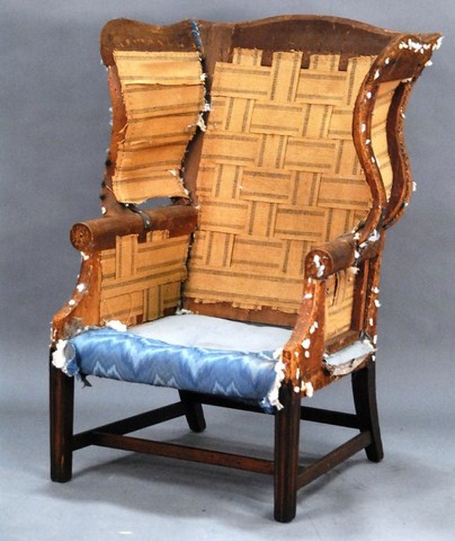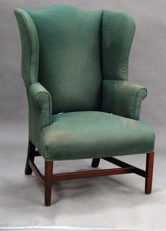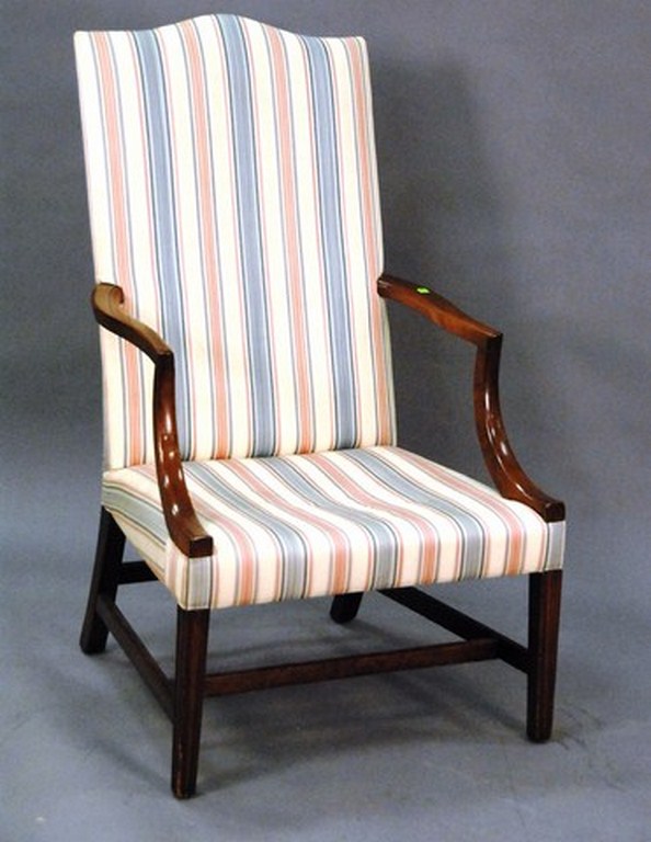 Federal cherry lolling chair with upholstered back and seat with open arms on molded square tapered legs, circa 1790-1810. seat ht. 15 1/2in. back ht. 45in. From the collection of Thomas and Alice Kugelman
