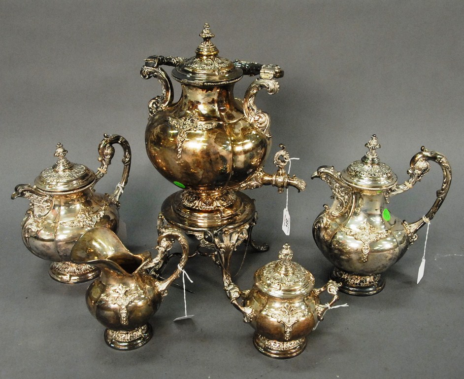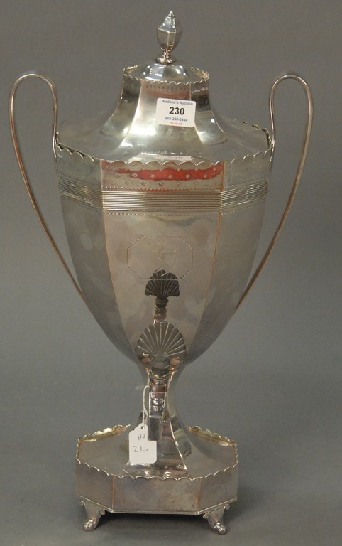 Sheffield silverplated hot water pot with spigot, early to mid 19th century. ht. 21in. Provenance: Estate of Charles Archibald Goodwin and Ruth Cheney Goodwin.