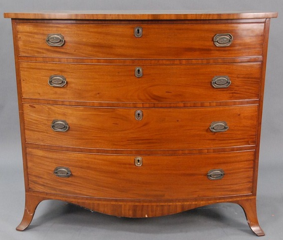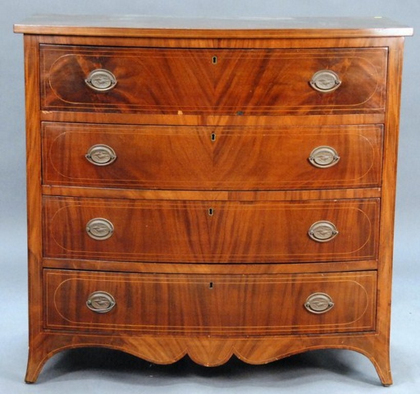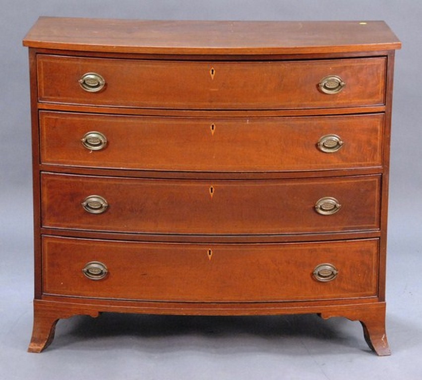 Federal mahogany chest with bowed front and line inlay all set on French feet. ht. 36in. wd. 40in. Provenance: Estate of Charles Archibald Goodwin and Ruth Cheney Goodwin.