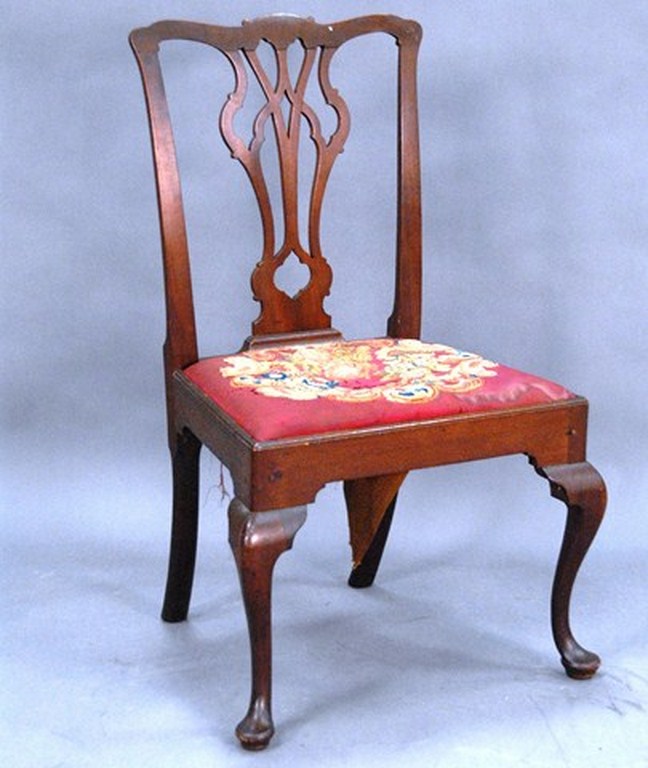 Chippendale mahogany side chair with slip seat cabriole legs and pad feet, 18th century. seat ht. 18in. back ht. 36in. Provenance: Estate of Judy McDonough Gengras of Stoner Drive, West Hartford, Connecticut.