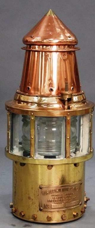Brass and copper nautical lantern, masthead or buoy lantern with makers label Gas Accumulator Co. UK LTD Lighthouse Engineers Beacon Works Brentford, England. ht. 21in.