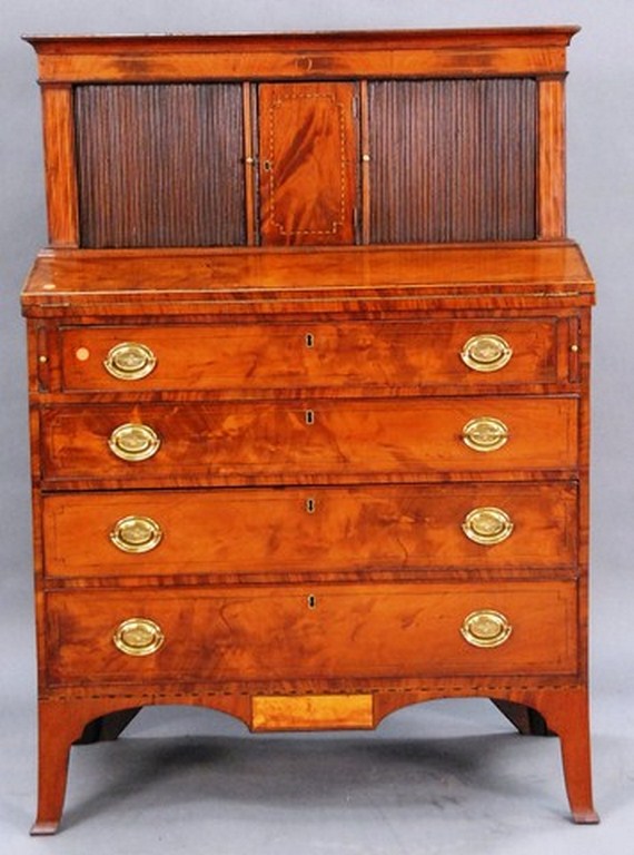 Federal mahogany desk with tambour doors, flip lid writing surface over four drawers set on French feet, circa 1800. ht. 32in. wd. 36in. Provenance: Estate of Judy McDonough Gengras of Stoner Drive, West Hartford, Connecticut.