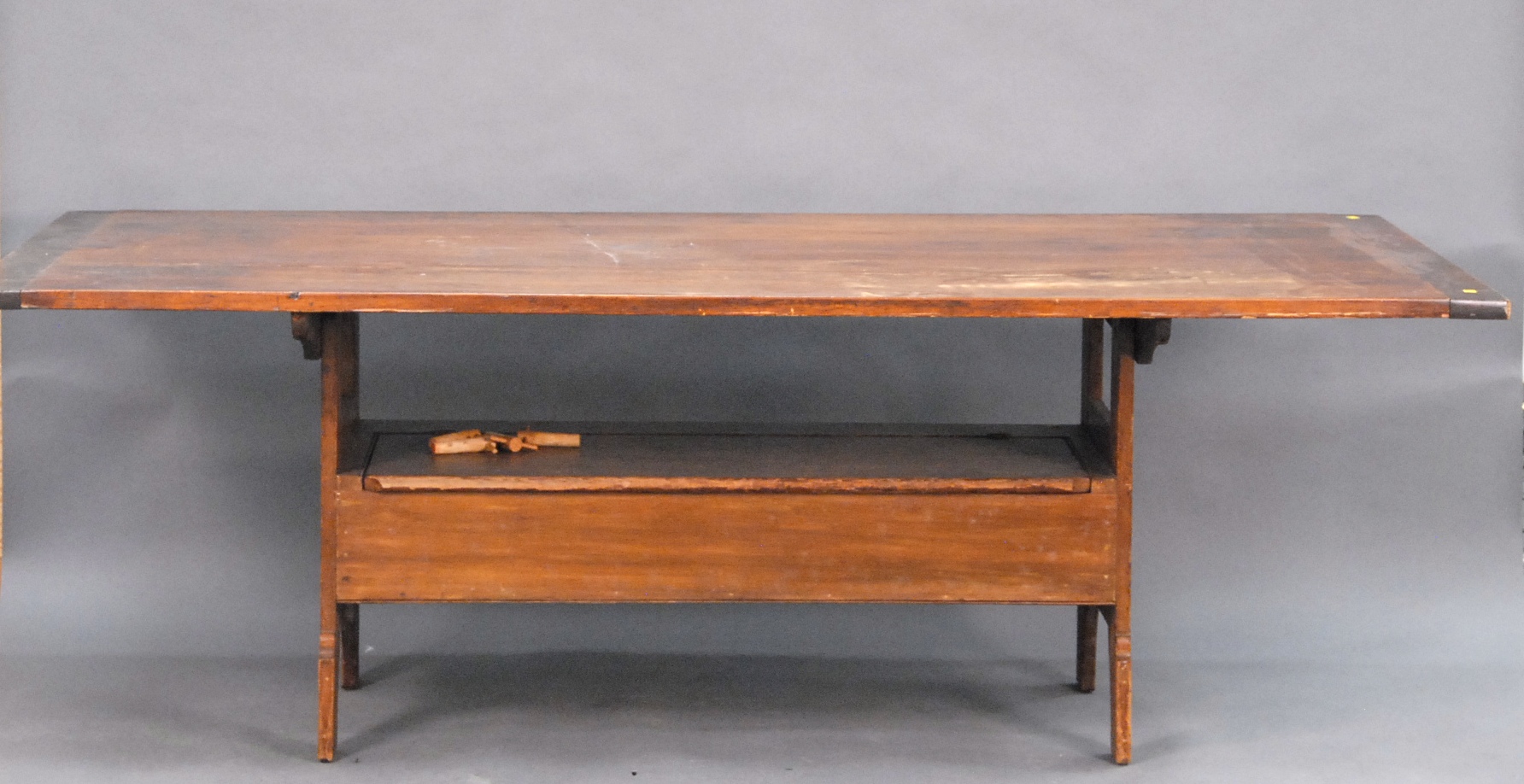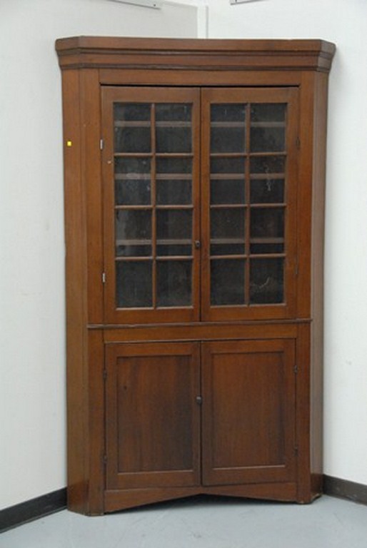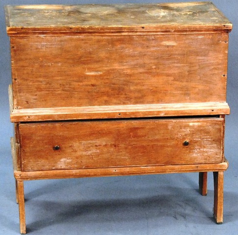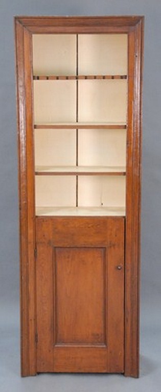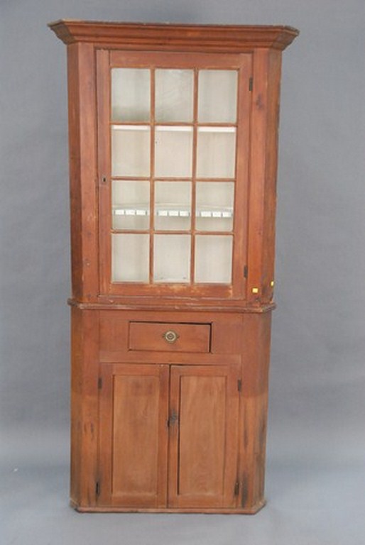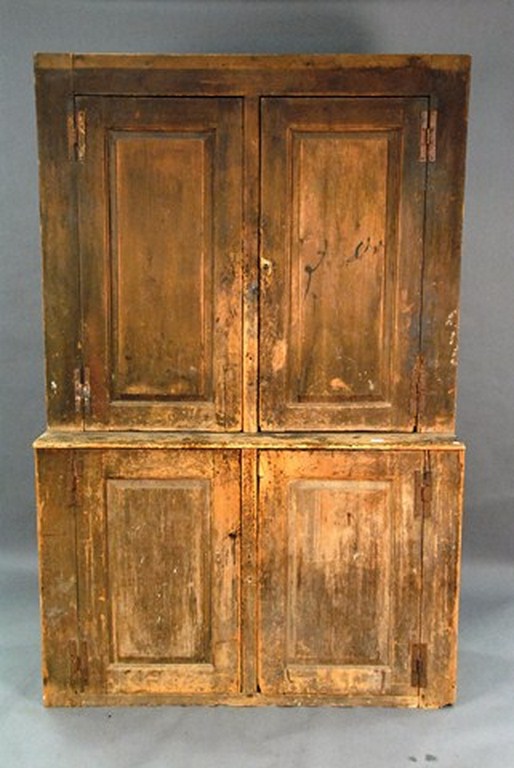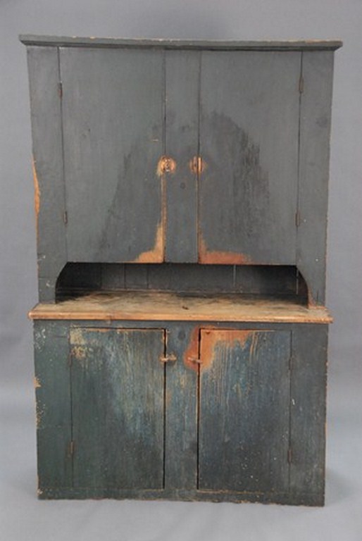 Primitive step-back cupboard having two raised panel doors in upper section over two raised panel doors in base, 18th century in original surface. ht. 83 1/2in. wd. 55in. dp. 19in.