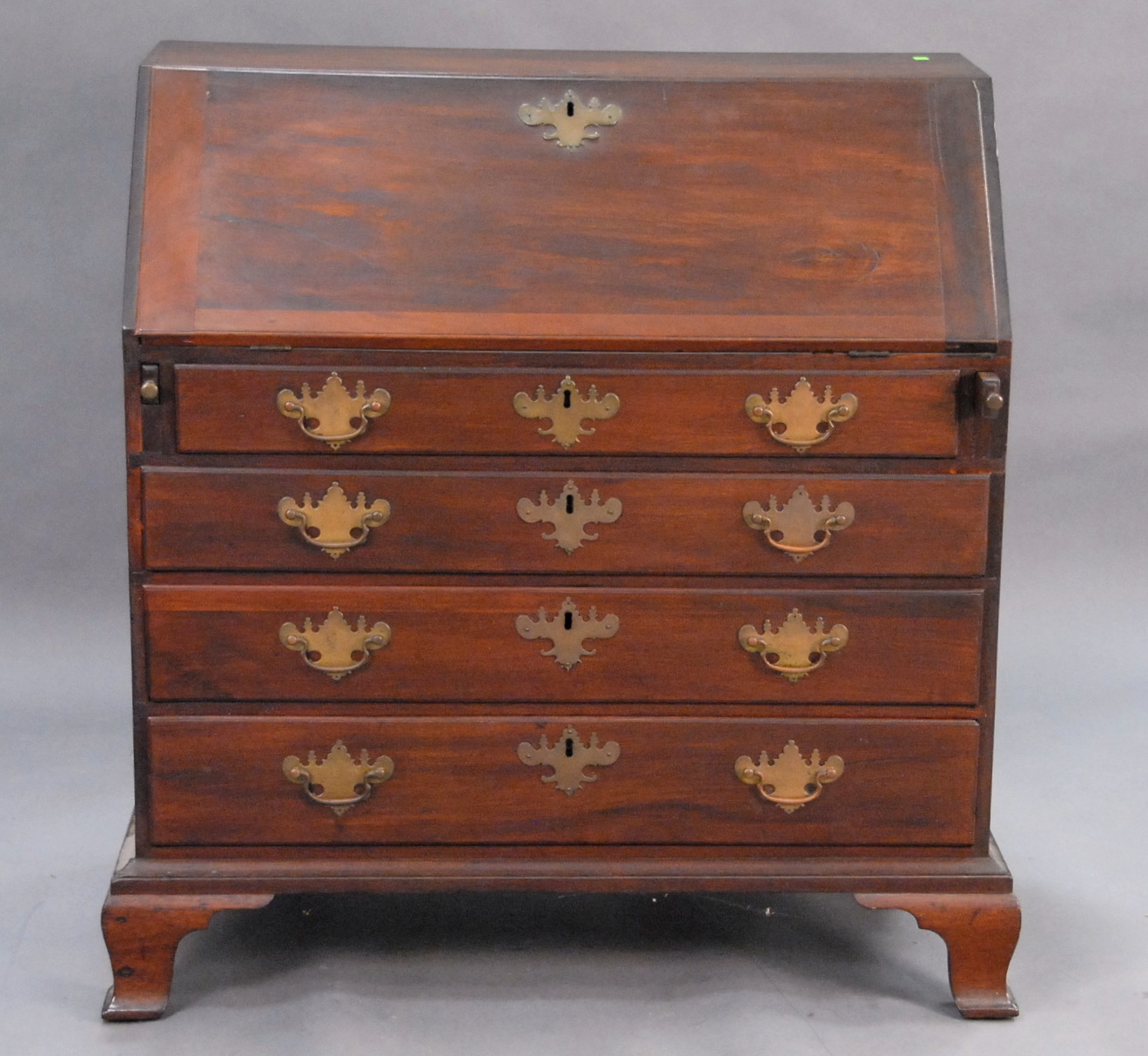 Chippendale desk with slant lid over four drawers on ogee bracket base and large original brasses. 42in. wd. 39in. dp. 21in. Being sold to benefit a Connecticut Museum.