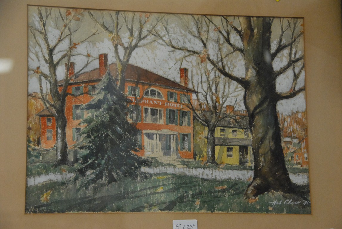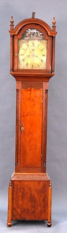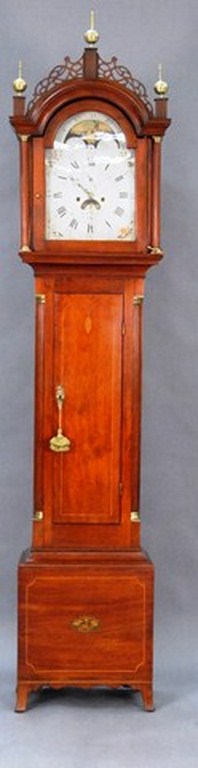 Federal cherry tall case clock, case with fret work top and brass finials over tombstone door over rectangular door flanked by fluted quarter columns on base with flared French feet, case with line, drop, and eagle inlay, dial is painted porcelain marked Benj Hanks Litchfield, CT with moon phases, calendar, and brass works. ht. 90in. Provenance: Estate of Judy McDonough Gengras of Stoner Drive, West Hartford, Connecticut.