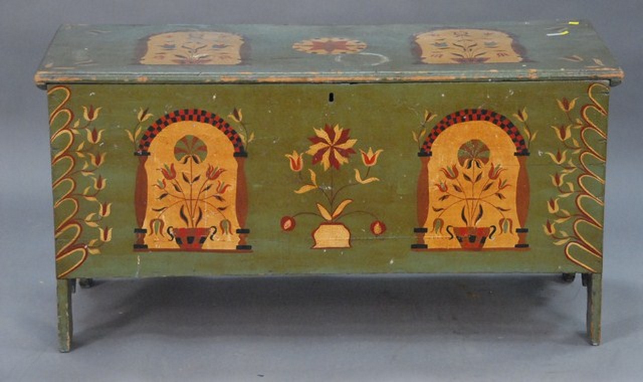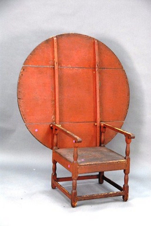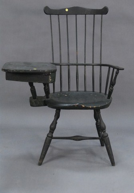 Windsor chair with fan back, writing arm with drawer all set on bold turned legs in old green paint over green paint, 18th century. seat ht. 18in. back ht. 44in. Provenance: Estate of Charles Archibald Goodwin and Ruth Cheney Goodwin.