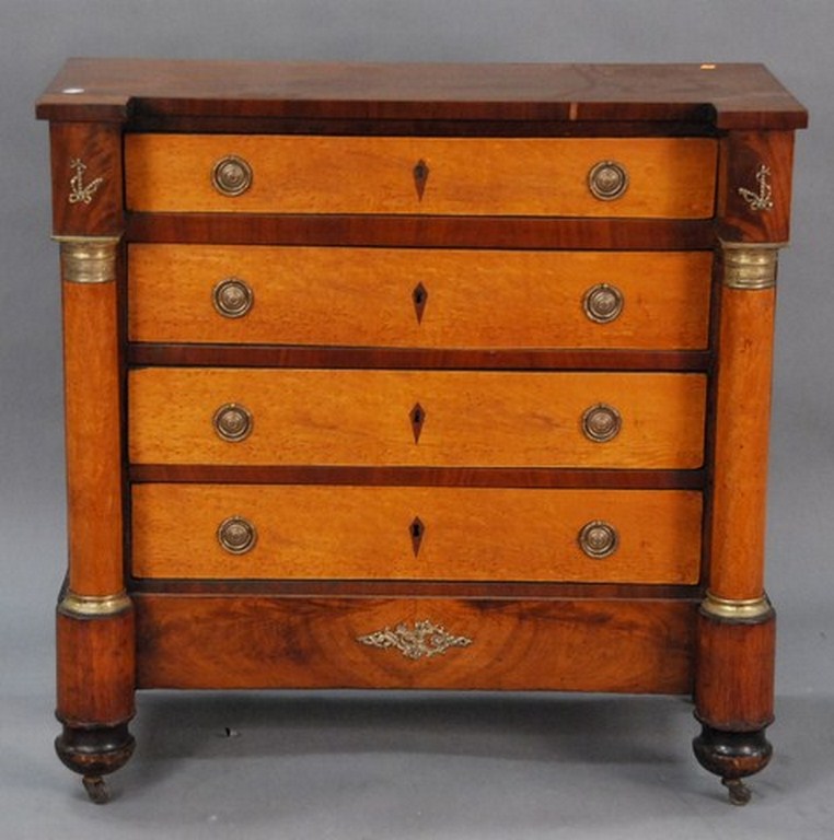Small American classical mahogany and birdseye maple chest, stepped overhanging drawer with four graduated drawers beneath, flanked by ormolu trimmed column and ending in turned feet, New York State first half 19th century. made up.