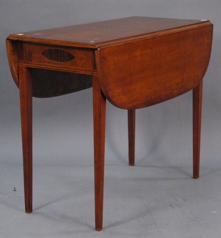 Connecticut cherry Hepplewhite Pembroke table, oval top with double drop leaves, having string inlaid edge, ends having rectangular and oval mahogany paneled inlay surrounded by banded and boxwood inlay with one real drawer, raised on square tapered boxwood string inlaid legs, circa 1790-1805. ht. 29in. lg. 36in. wd. 17in. Provenance: From the collection and estate of Richard Gilpin originally from Framingham, MA and later from Yarmouth, MA.