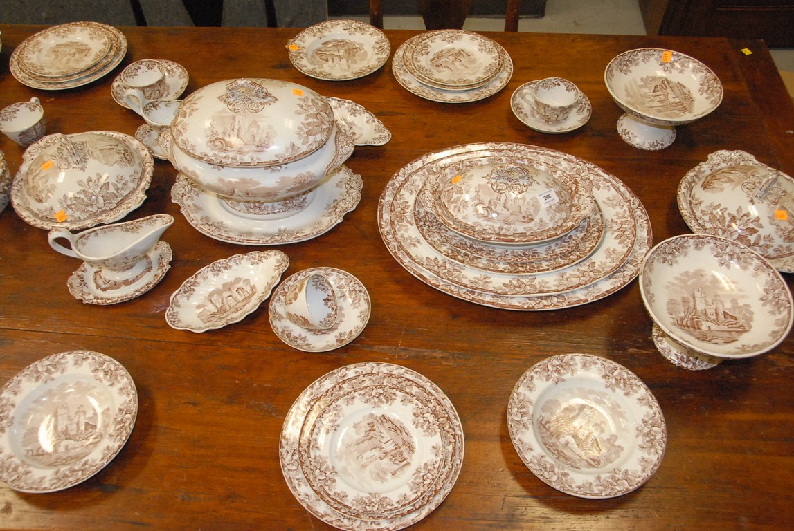 Copeland Stoke on Trent brown transfer china dinner set 105 pieces including covered tureen, underplate, nest of three trays, and three covered vegetable dishes.