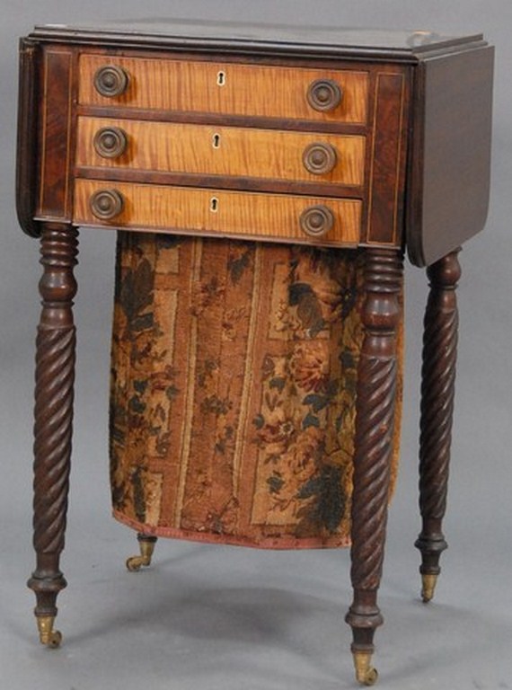 Sheraton mahogany sewing table, molded edge top having drop leaves with three tiger maple drawers, retaining period brass pulls, top drawer with desk interior and the base drawer with fabric sewing bag, whole raised on tapering turned spiral carved legs, retaining original brass ferrels and casters, first quarter 19th century. ht. 29 1/2in.