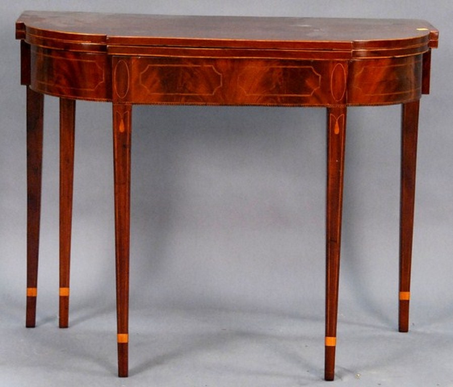 Federal mahogany games table with D shaped top over conforming skirt all set on square tapered legs with line and drop inlays, circa 1800. ht. 29in. wd. 17in.