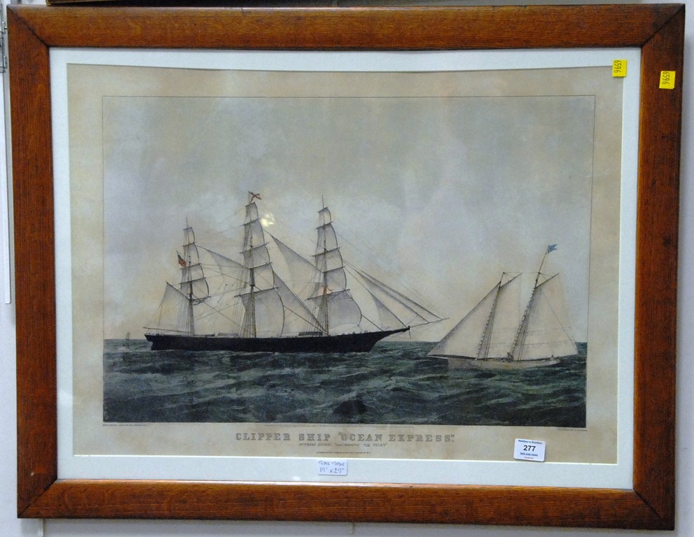 CLIPPER SHIP OCEAN EXPRESS OUTWARD BOUND, DISCHARGING THE PILOT hand colored lithograph sketched by J. Smith & Son on Stone by C. Parsons published by N. Currier, New York 1856 sight size 19 x 25 1/2