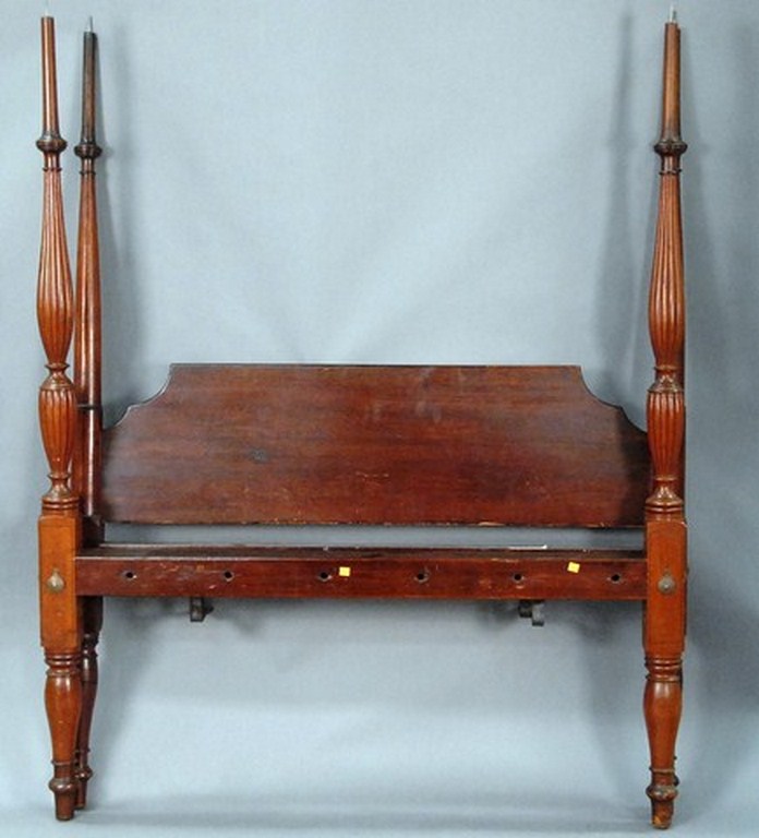 Sheraton mahogany and hardwood canopy bedstead, turned front posts with reeded upper section, having banded inlay beneath, head posts with matching turnings, bed retains its original headboard, arched canopy and full length rails. ht. 84in.