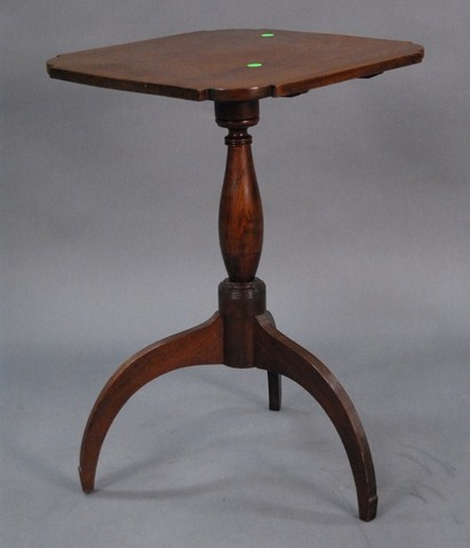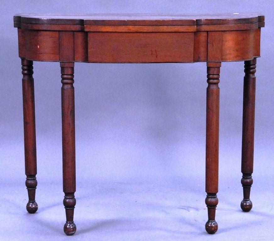 Sheraton cherry game table with shaped top set on plain turned legs, circa 1830. ht. 29 1/2in. open: 35 x 35 Provenance: Estate of Charles Archibald Goodwin and Ruth Cheney Goodwin.
