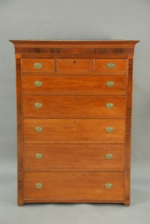 Federal three over six drawer tall chest with inlaid mahogany panels and original brasses no feet. ht. 66 1/2in. wd. 41in. dp. 23 1/2in. Provenance: Estate of Charles Archibald Goodwin and Ruth Cheney Goodwin.