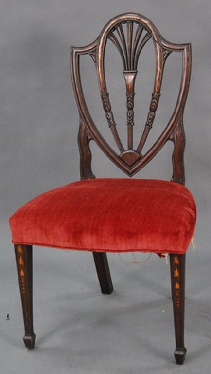 Federal mahogany side chair with shield shaped vine inlaid back on bell flower inlaid square tapered legs, circa 1790-1810. seat ht. 18in. back ht. 40in. Provenance: Estate of Judy McDonough Gengras of Stoner Drive, West Hartford, Connecticut.