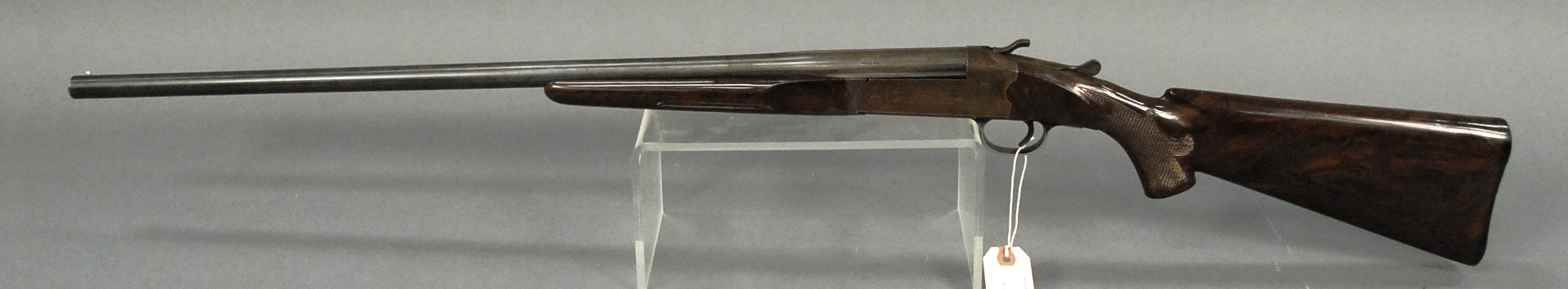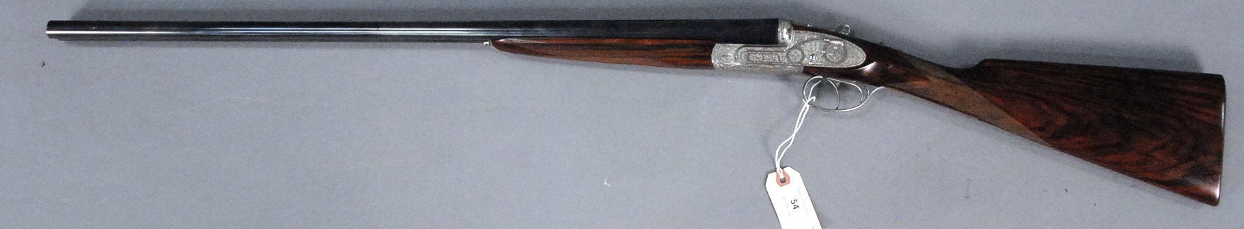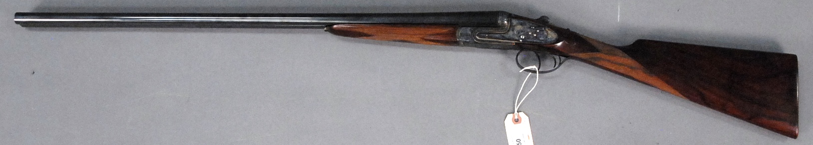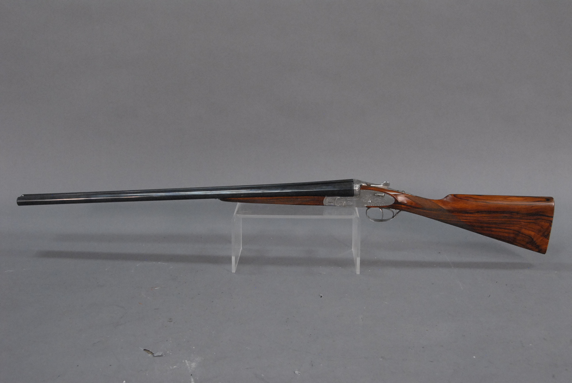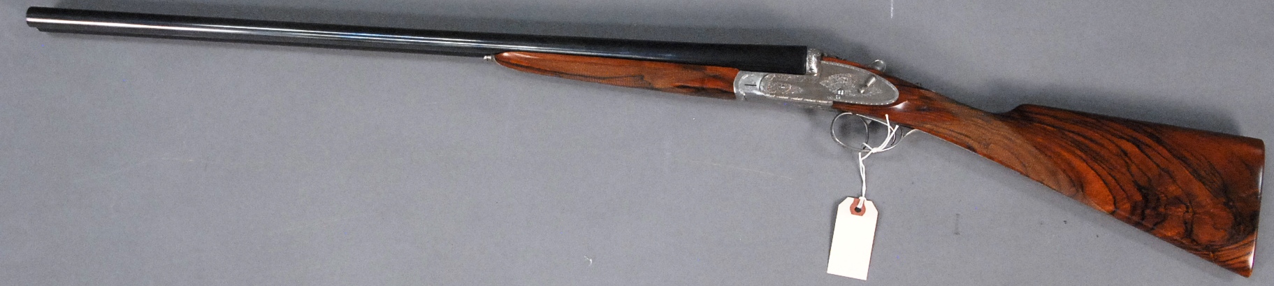 Armas Garbi, model 101, shotgun, William Larkin Moore & Co., side by side, 12 ga. having hand engraved Continental style large scrolls, double triggers, finely checkered splinter fore-end, and straight burl walnut stock, barrel lg. 28, sn 07298, 348.
