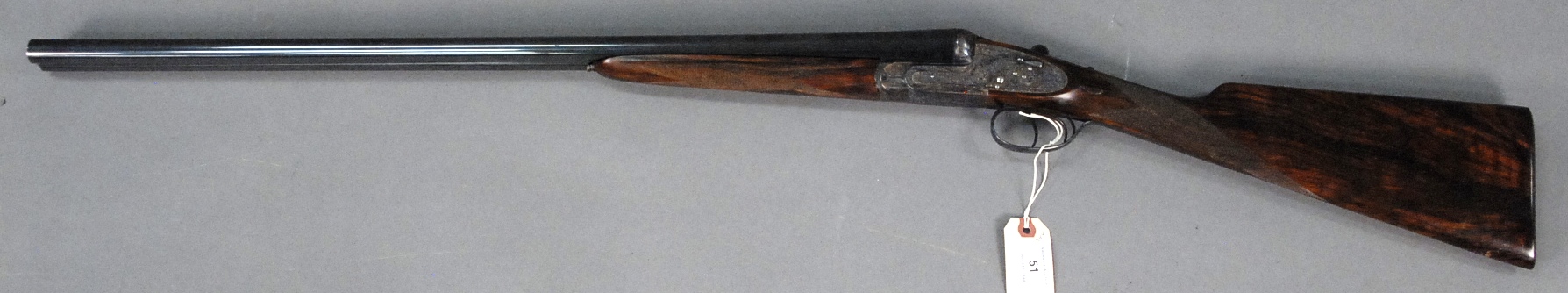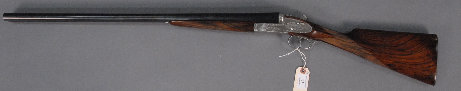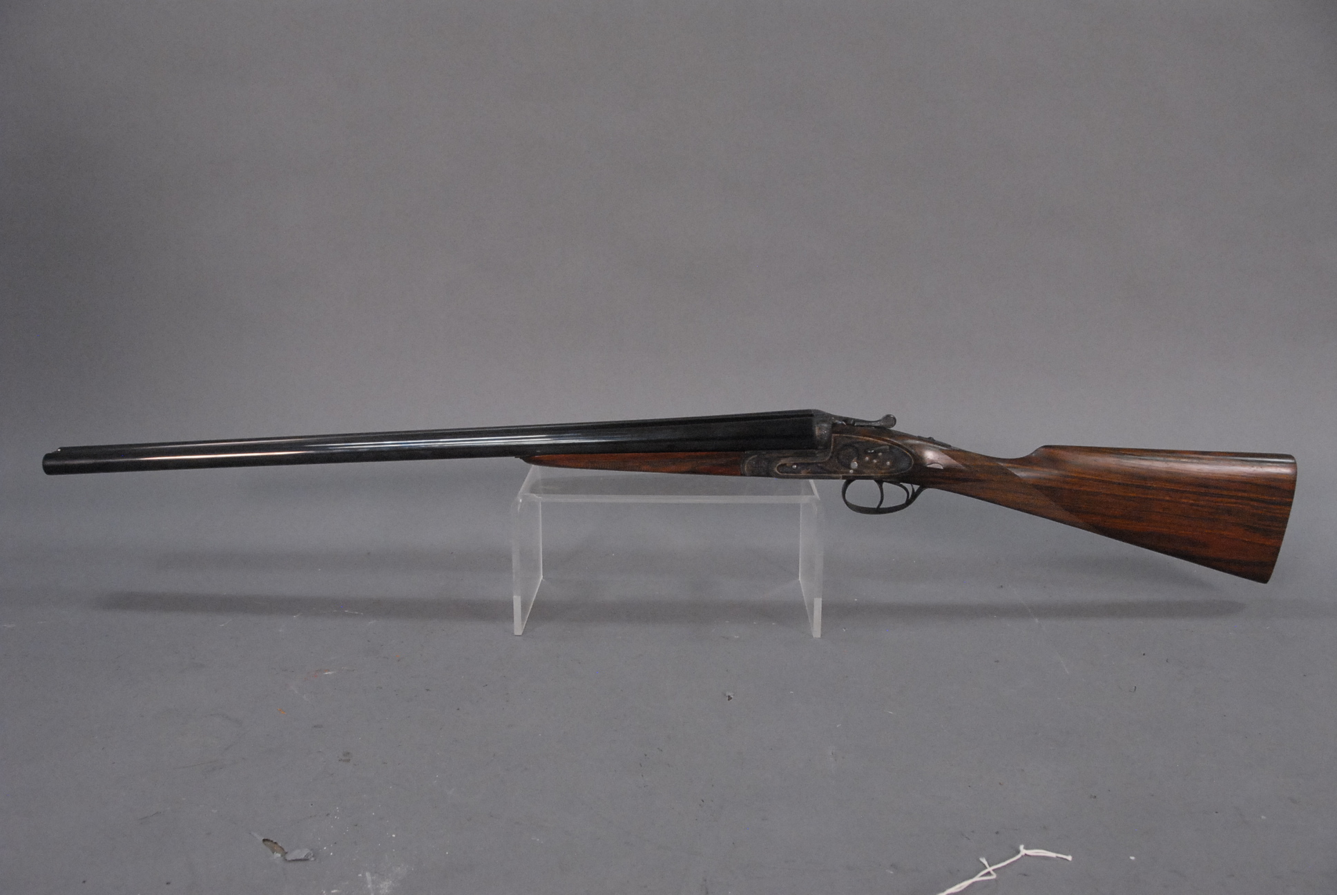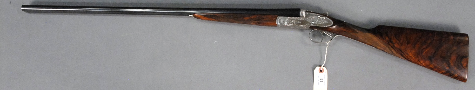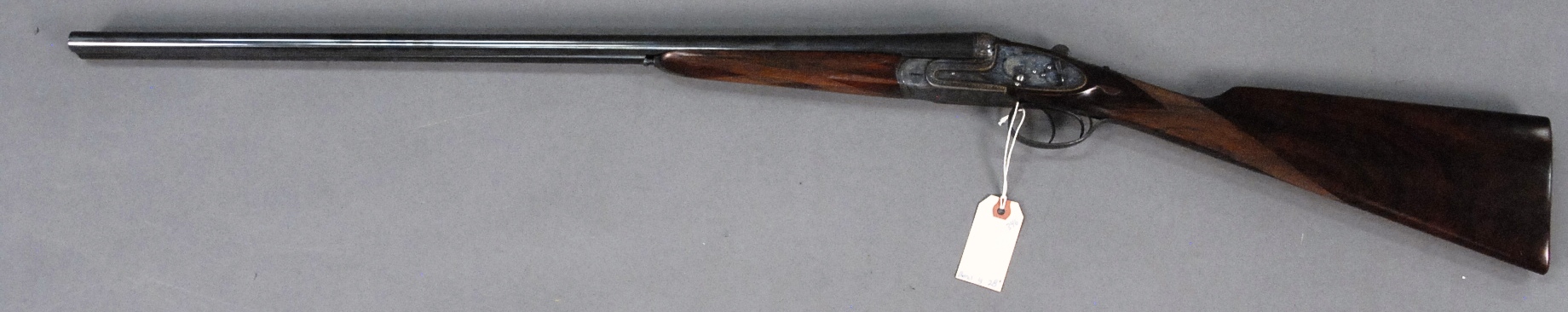 Armas Garbi, model 101, shotgun, William Larkin Moore & Co., side by side, 12 ga. having hand engraved Continental style large scrolls, double triggers, finely checkered splinter fore-end, and straight burl walnut stock, barrel lg. 28, sn 07298, 348.