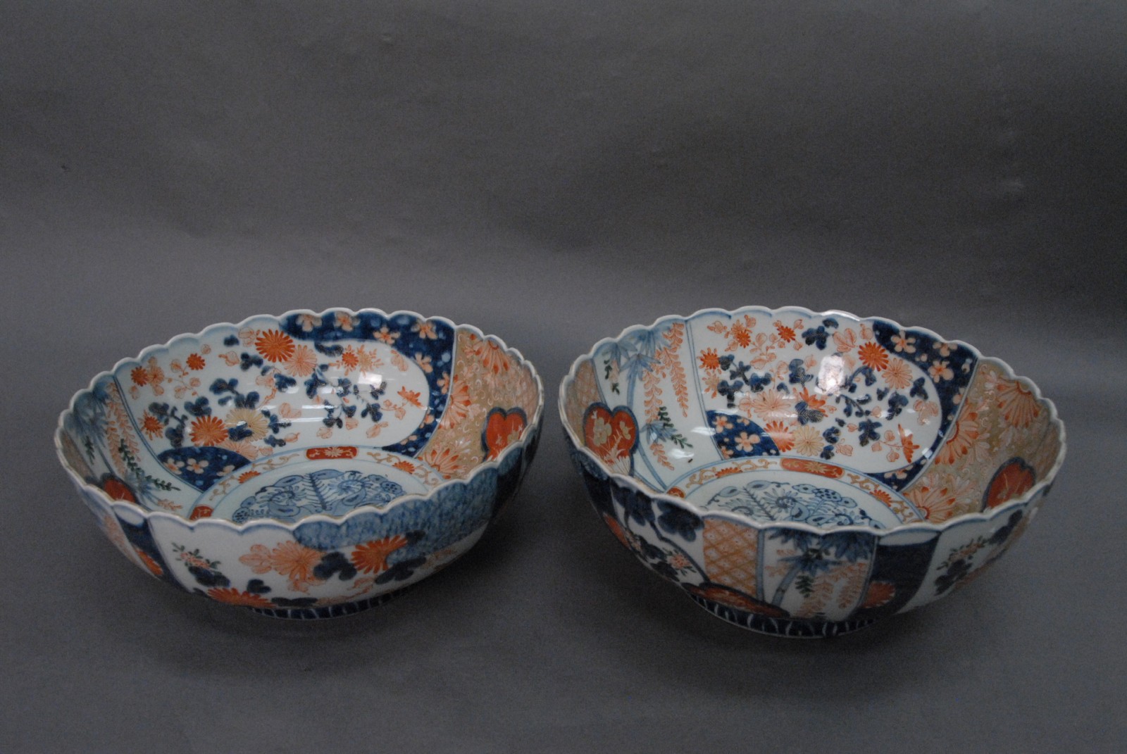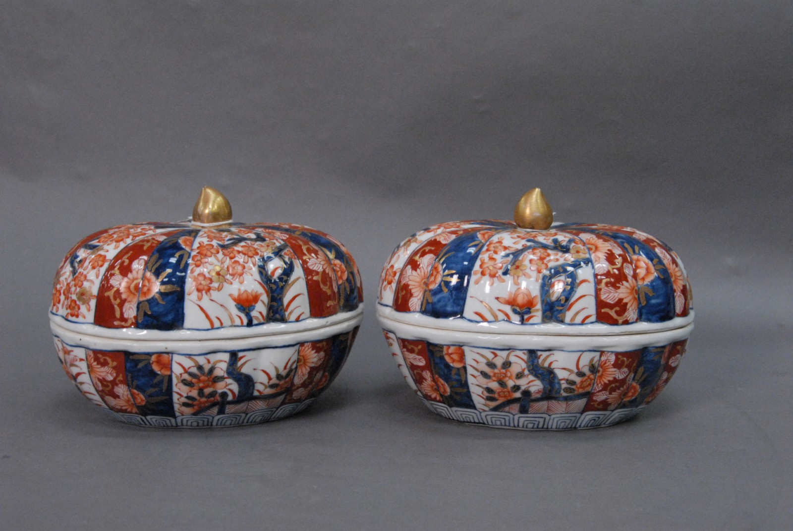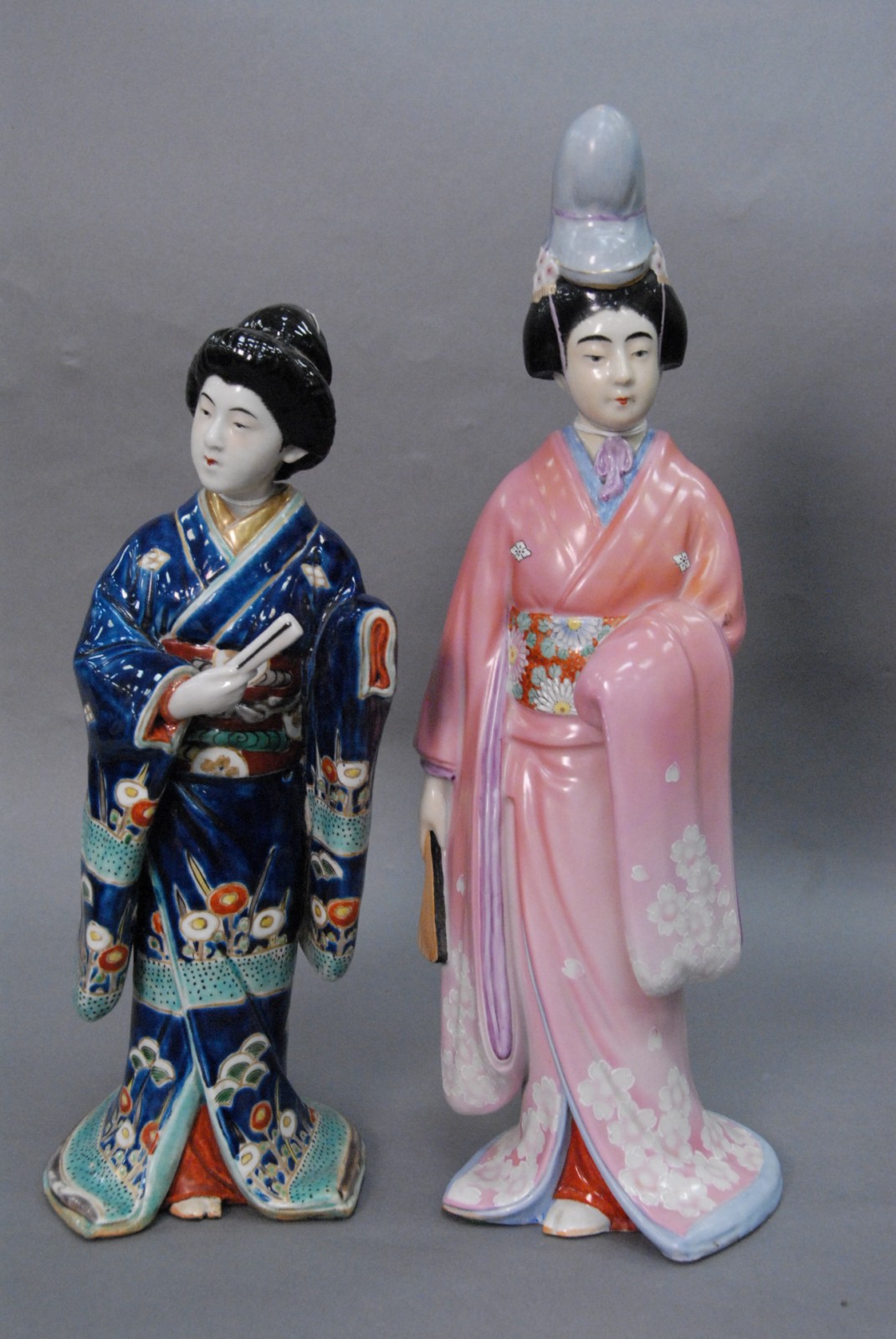 Two Japanese Imari standing figures of women, first is an unusual court lady with pink robe and high headdress and an attendant or Geisha in blue robe both Meiji period late 19th century.