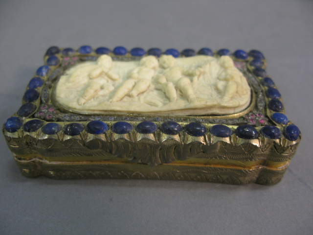 Silver hinged cover box mounted having carved ivory panel surrounded by lapis stones with gold wash interior along with original receipt from Italy 1928. Provenance: Governor Henry Roberts Edward Roberts 1110 Prospect Ave Hartford to present owner.