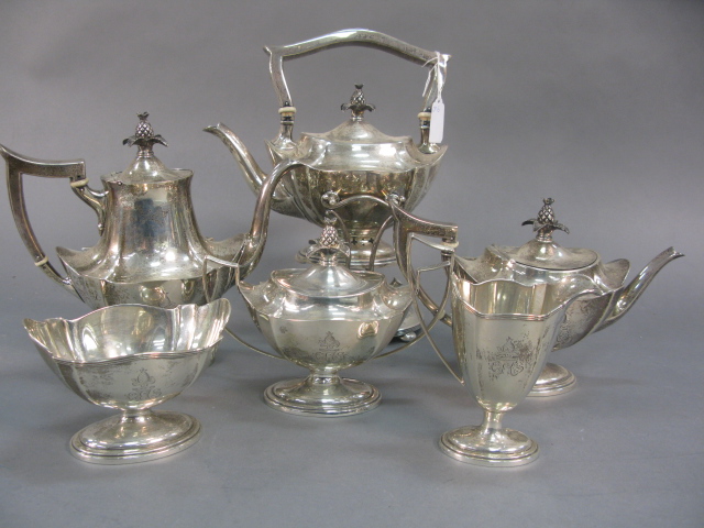 Gorham six piece sterling silver tea and coffee set to include tilting pot, teapot, coffee pot, covered sugar, creamer and waste bowl. Provenance: Governor Henry Roberts Edward Roberts 1110 Prospect Ave Hartford to present owner.