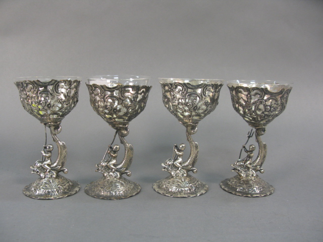 Set of four Continental silver cocktail dishes having reticulated bodies on four puttis riding on dolphin base one fork, in putti hand, as is. Provenance: Governor Henry Roberts Edward Roberts 1110 Prospect Ave Hartford to present owner.