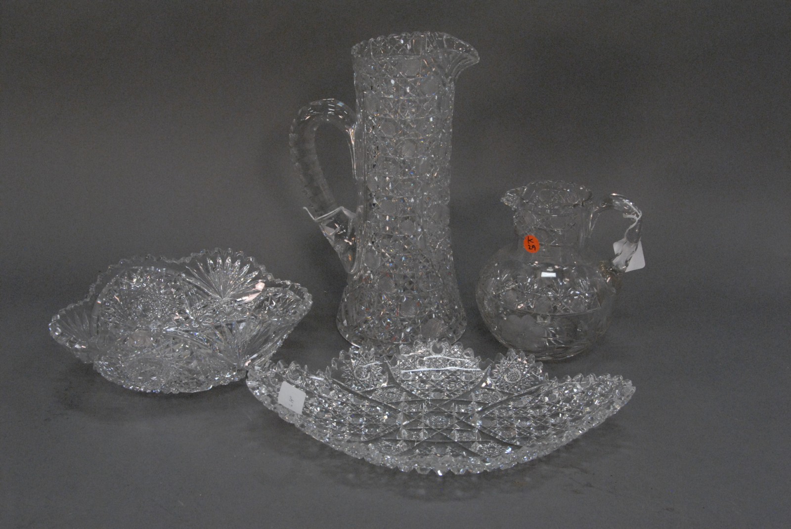 Twenty one piece lot of earthenware to include crock with two handles, four pitchers each with all over blue decoration, three large chargers, five footed bowls, five large bowls and three small stands, Spanish 18th – 19th century as is.