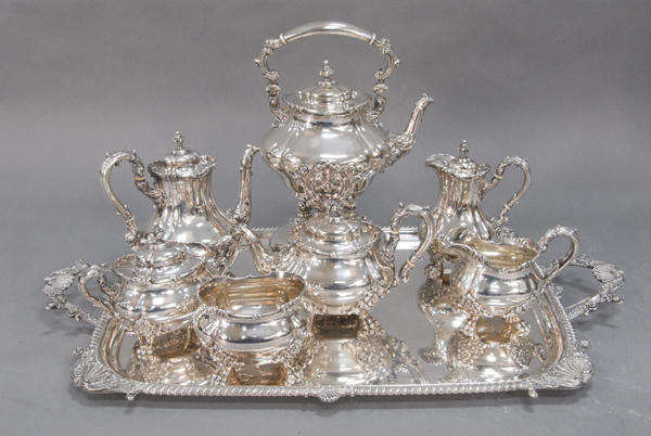 Howard eight piece sterling silver tea and coffee set to include, tilting pot, coffee pot, teapot, covered creamer, covered sugar, open creamer and waste bowl on claw feet, with tray having shells and gadrooned edge.