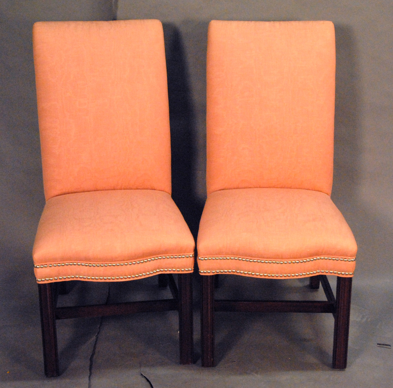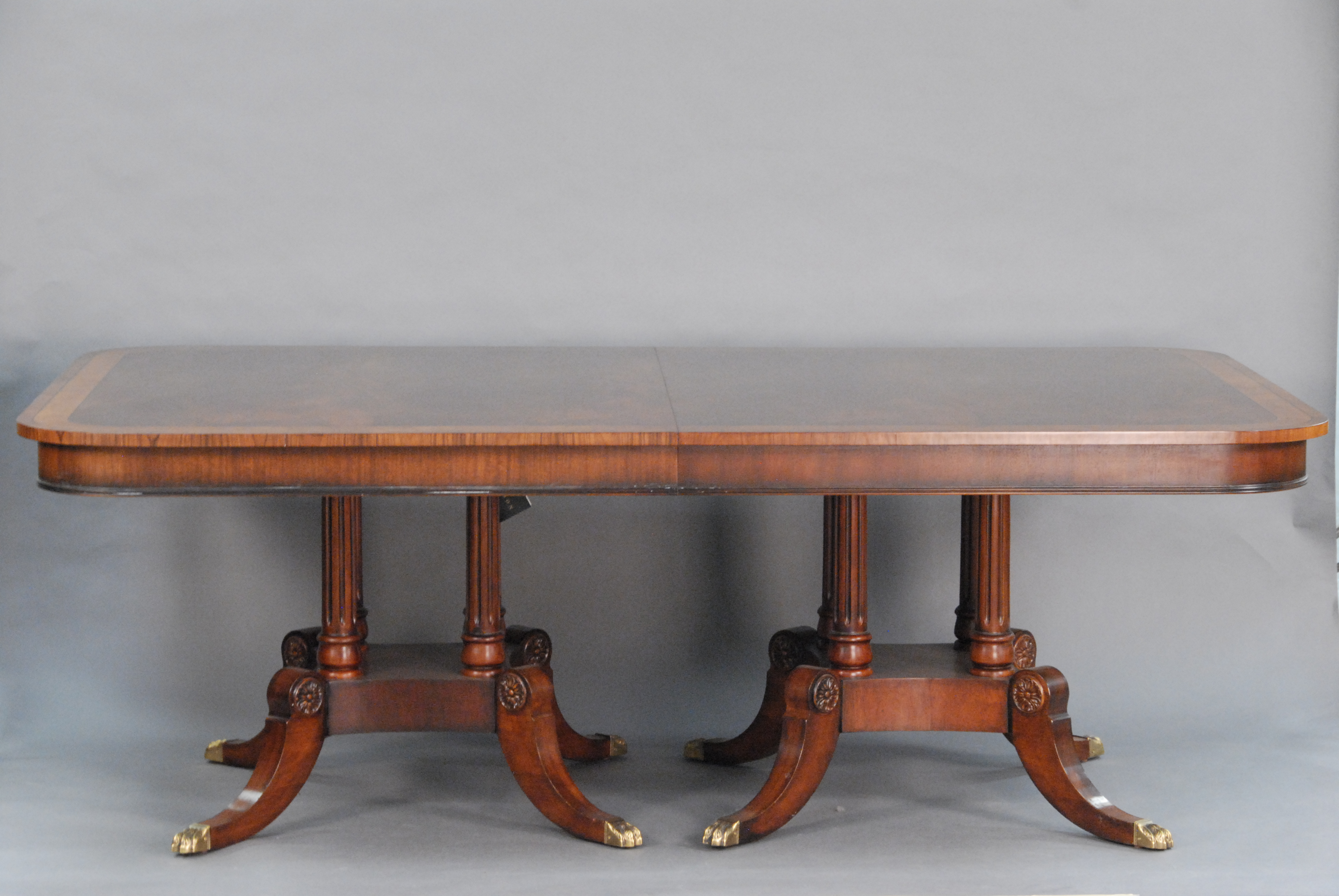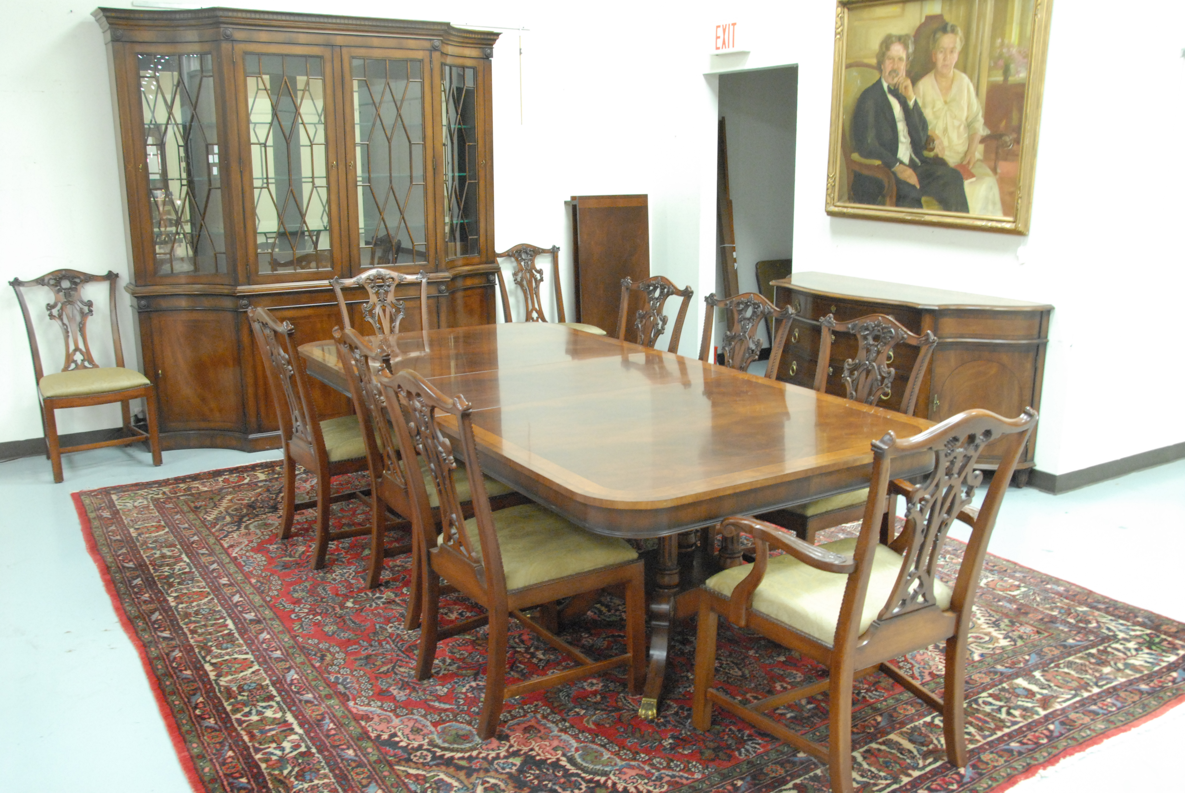 Eleven piece Oxford Classics Henredon dining table and ten Chippendale style chairs with pierce carved backs and banded inlaid double pedestal table, three leaves and custom pads, in new condition.
