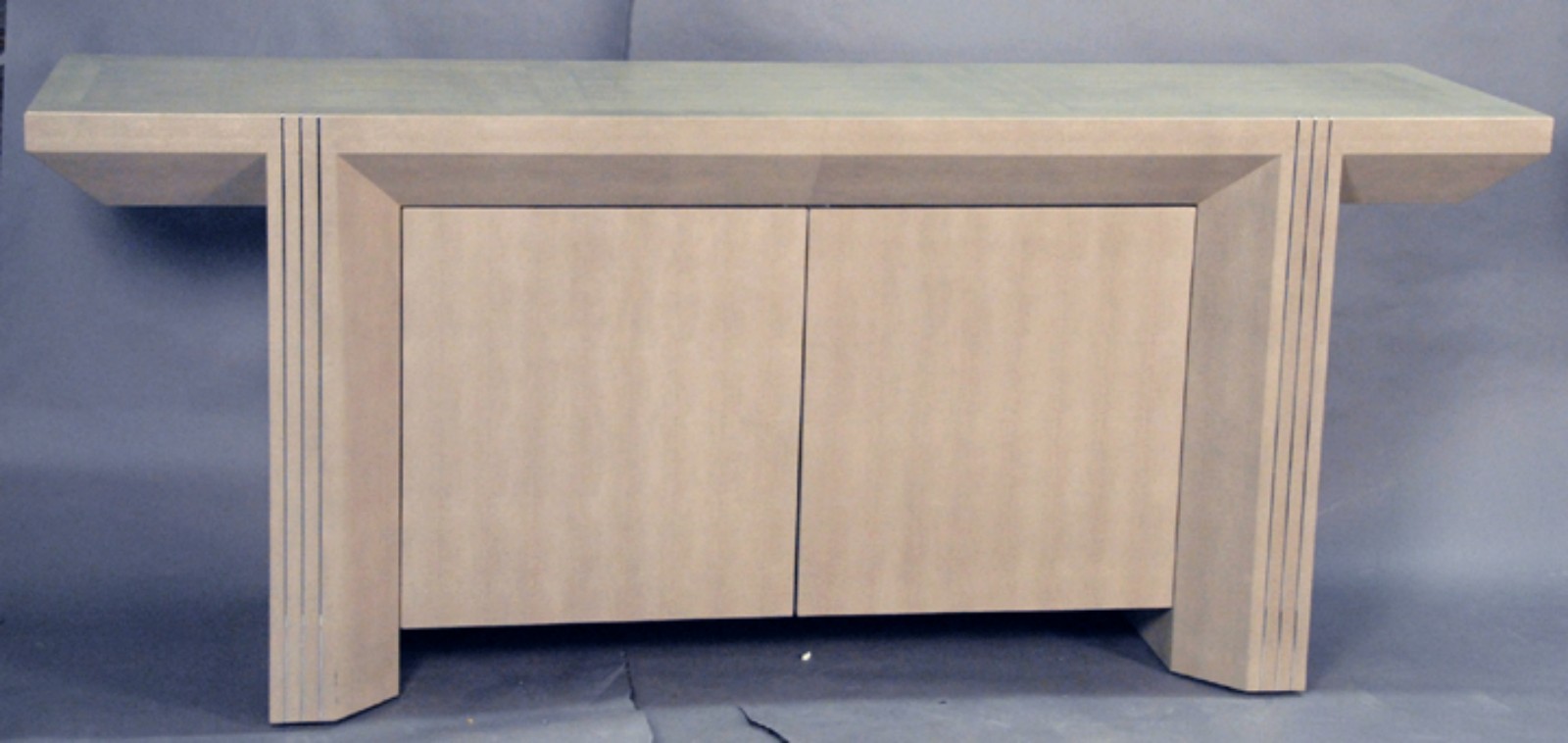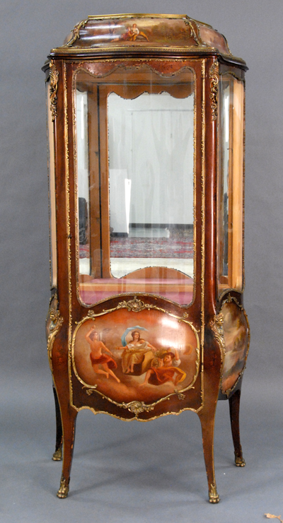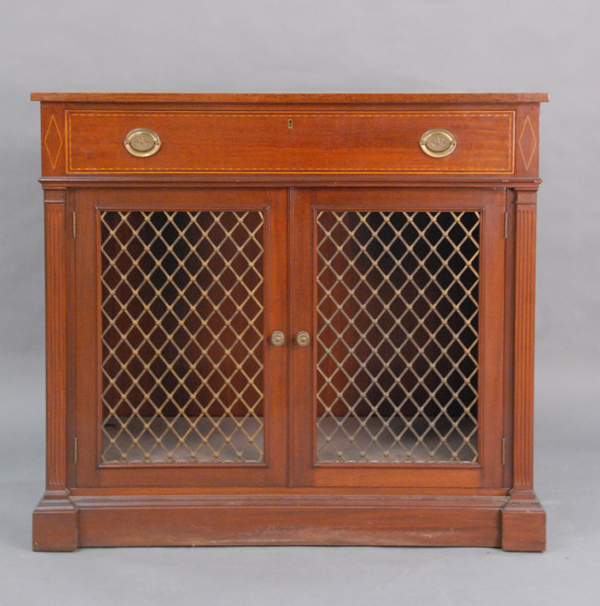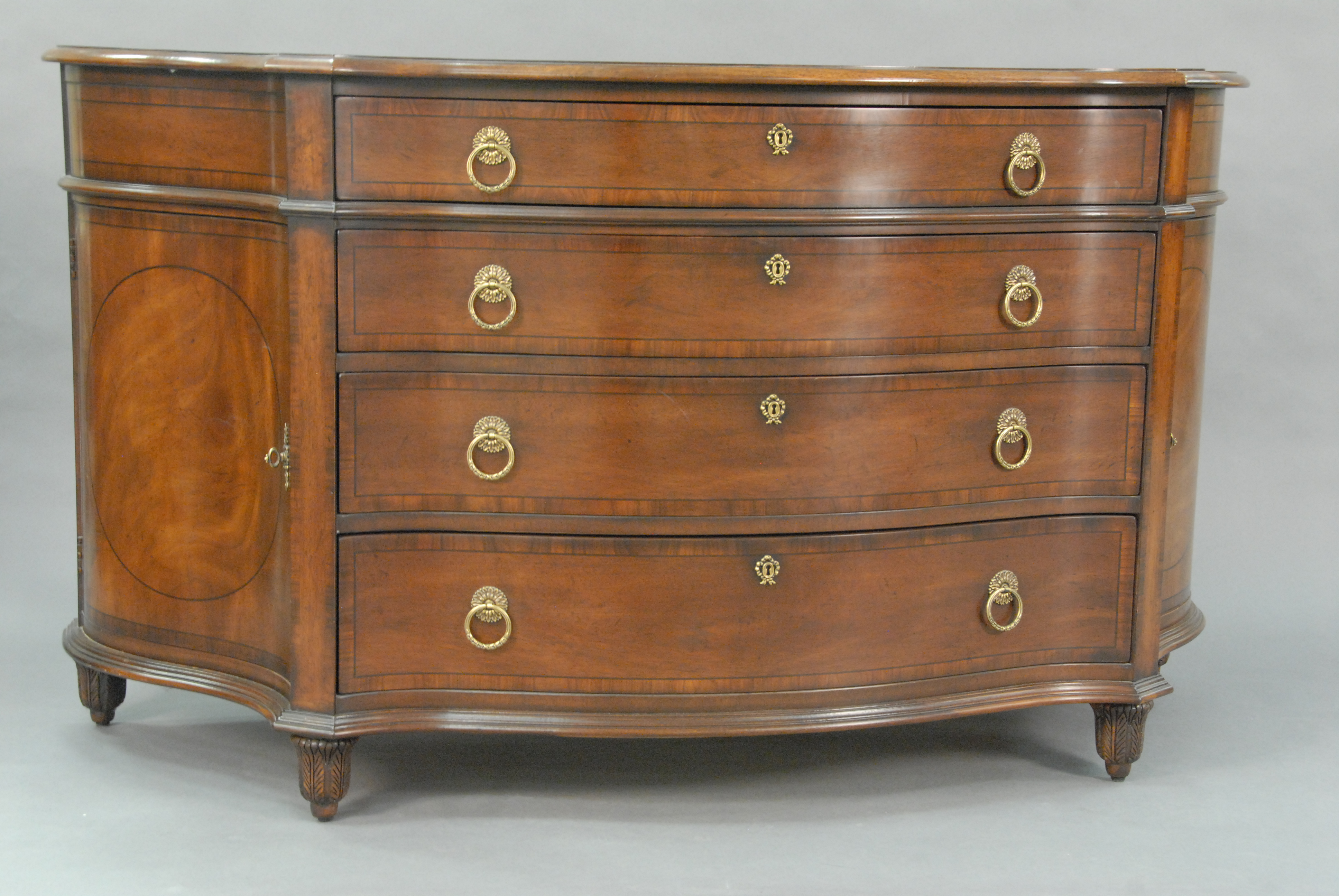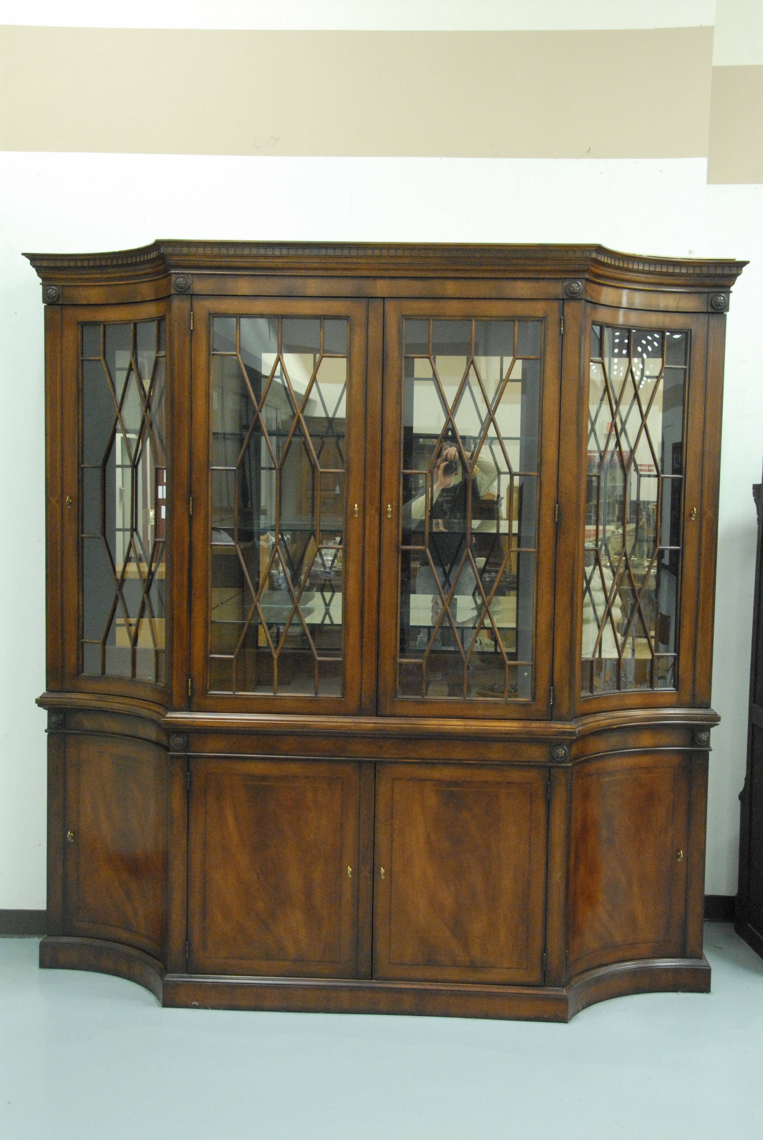 Henredon Oxford Classics breakfront in two parts with mirror back and glass shelves with four glass doors in upper section and four wood doors with line and band inlays and silver drawer inside.