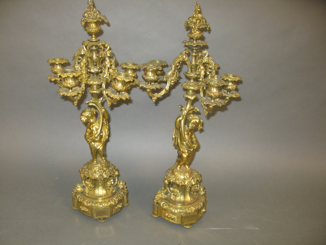 Pair of gilt bronze six light candelabra with cherub bases having grape and vine pattern repair. Provenance: Governor Henry Roberts Edward Roberts 1110 Prospect Ave Hartford to present owner.