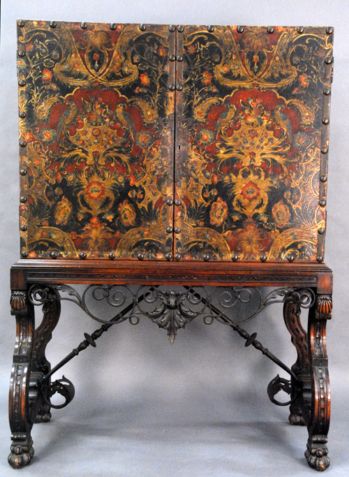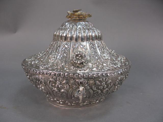 Silver jewel box with key and bird finial having tag marked Turkish Jewel Box 17th century, bought of Mrs. Anna Cary 1937, side handles are detached but available. Provenance: Governor Henry Roberts Edward Roberts 1110 Prospect Ave Hartford to present owner.