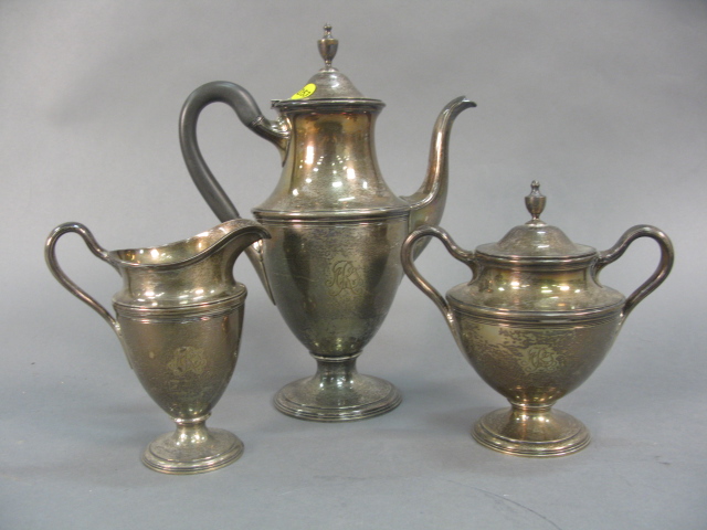 Tiffany and Company three piece tea set with teapot, creamer and covered sugar marked Tiffany and Company makers, monogrammed. Provenance: Governor Henry Roberts Edward Roberts 1110 Prospect Ave Hartford to present owner.