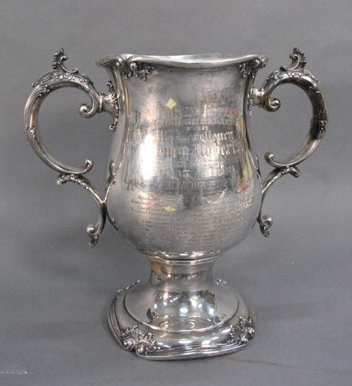 Sterling silver trophy with two elaborate handles, engraved For His Excellency Henry Roberts Governor of CT 1905 – 1906, from his staff with listing of names. Provenance: Governor Henry Roberts Edward Roberts 1110 Prospect Ave Hartford to present owner.