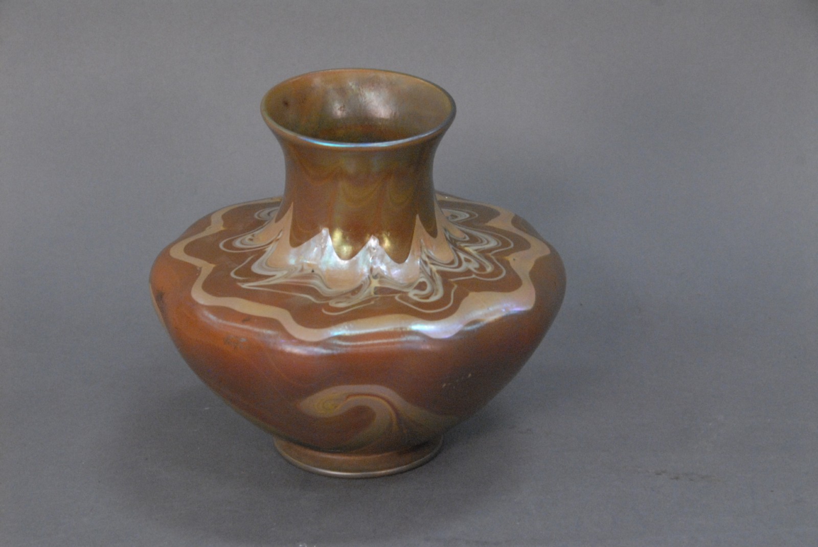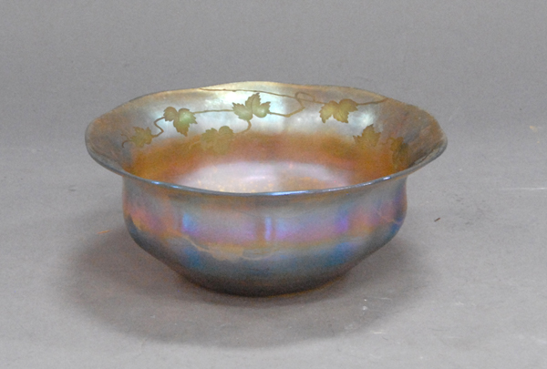 Tiffany gold iridescent bowl with cut vine and leaf pattern signed L.C. Tiffany Favrile. Provenance: Governor Henry Roberts Edward Roberts 1110 Prospect Ave Hartford to present owner.
