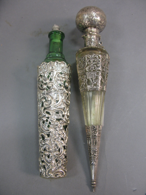 Two large scent bottles with silver overlay, one with silver top and one with top missing. Provenance: Governor Henry Roberts Edward Roberts 1110 Prospect Ave Hartford to present owner.
