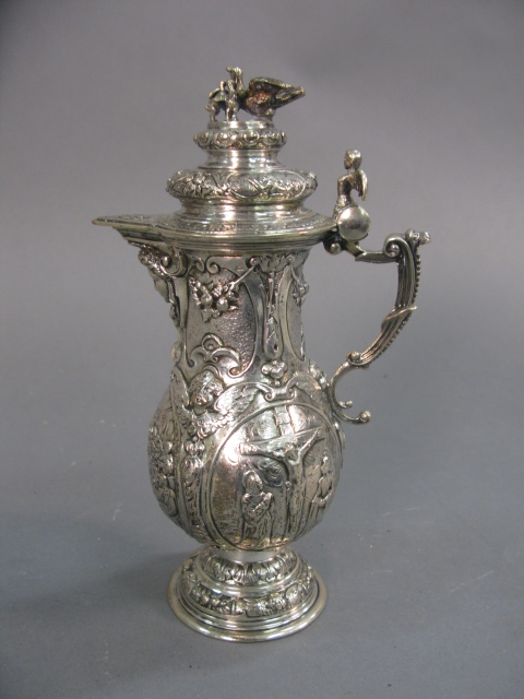 German silver ewer having three chased panels, The Resurrection, The Last Supper and The Crucifixion, top mounted with four birds along with letter from Fels Gallery Fifth Avenue New York to Mrs. Henry Roberts stating it is from Nurnberg circa 1600. Provenance: Governor Henry Roberts Edward Roberts 1110 Prospect Ave Hartford to present owner.