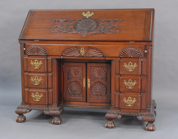 Mahogany Centennial slant front desk with shell carved lid, carved block front drawers and shell carved doors all set on ball and claw feet circa 1860.