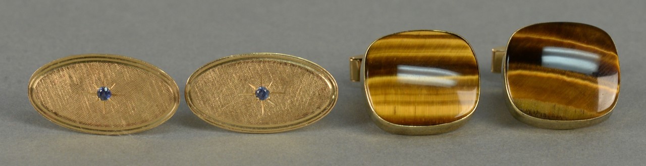 Two platinum and diamond clasps of rectangular form set with a combined total of sixteen full cut diamonds, four trillion cut diamonds, and twenty-four square cut diamonds, unmarked.