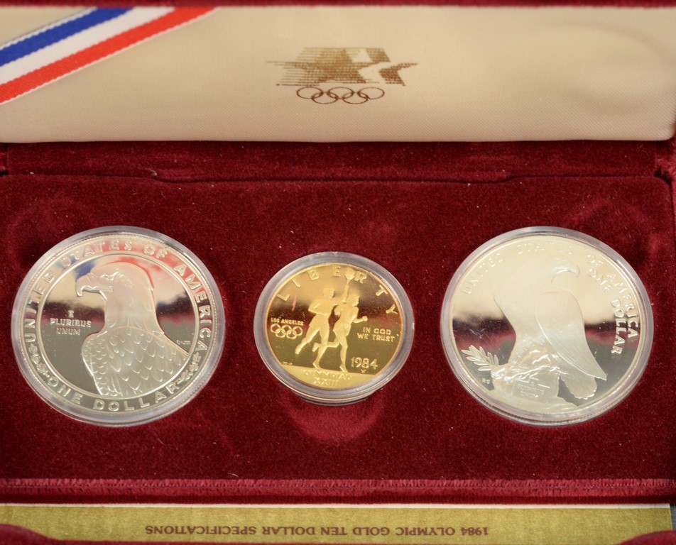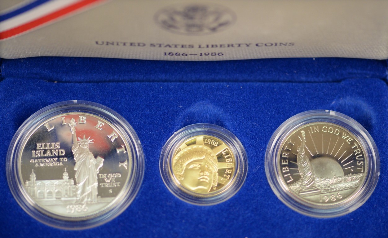 U.S. 1986 Liberty three proof coins including gold five dollar 8.359 grams .900 fine, proof silver dollar 26.73 grams .900 fine, and proof and clad half dollar.