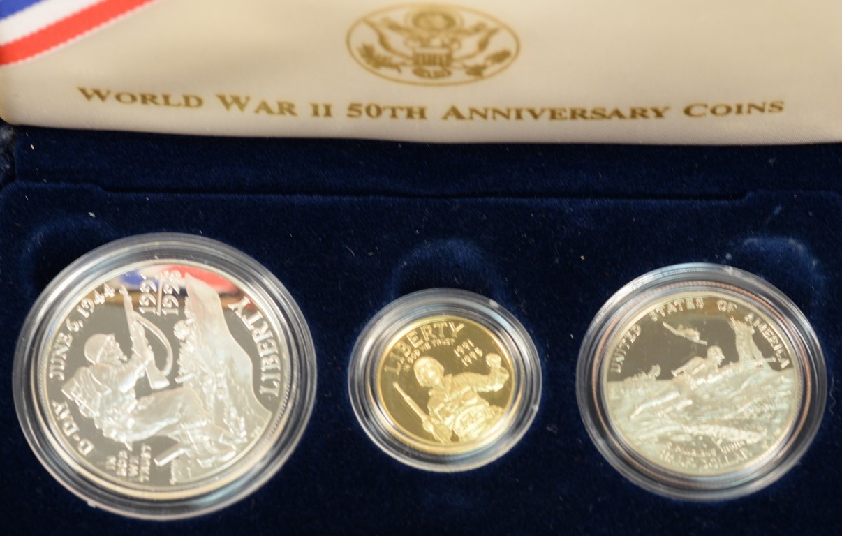 World War II 50th Anniversary Commemorative coins three piece set including proof five dollar gold 8.3 grams 90% pure, proof silver dollar 26.730 grams 90% pure, and proof silver half dollar clad.