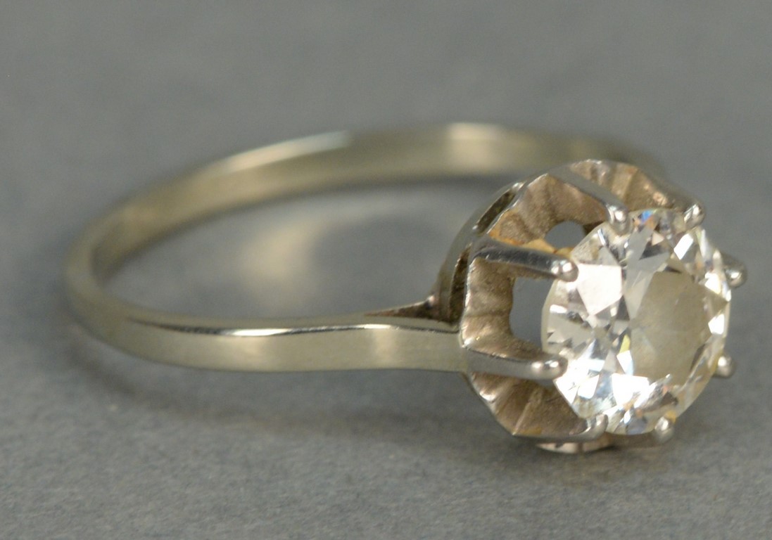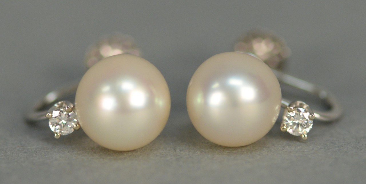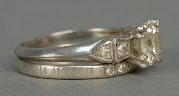 Platinum engagement ring having center diamond approximately .90cts. flanked by two small diamonds and a platinum wedding band set with five diamond chips.