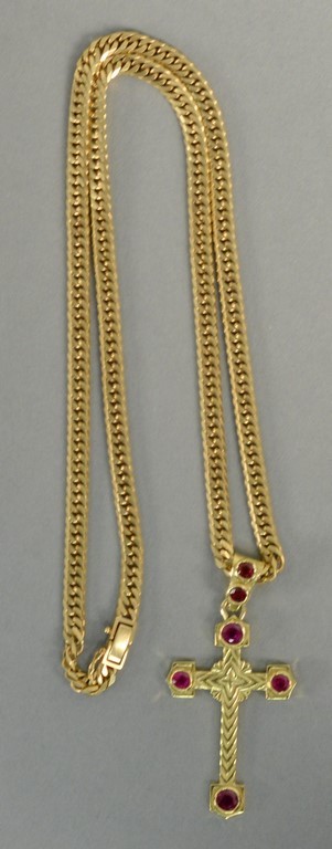 18K gold chain and cross set with six natural ruby corundum, two approximately 1ct, three approximately 1/2ct., appraisal available.